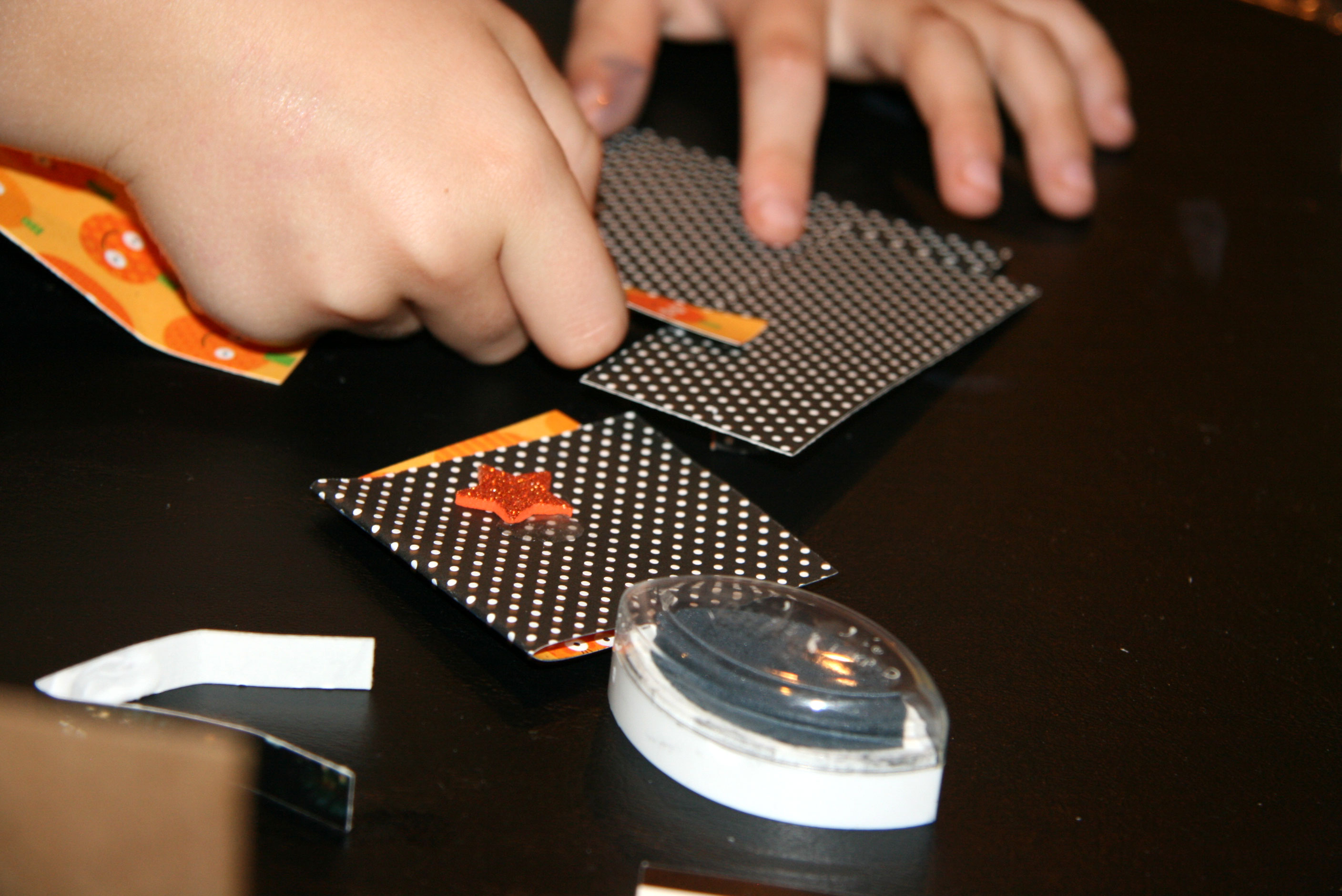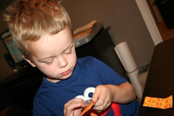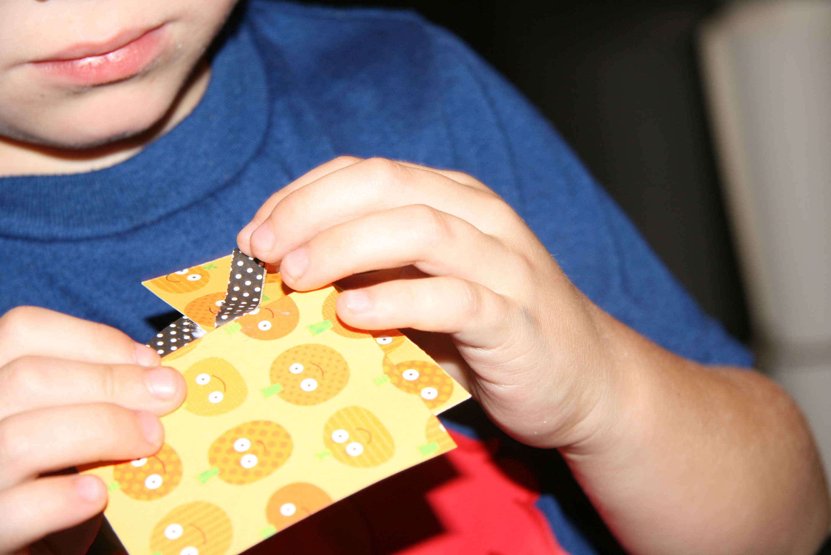 This morning we were playing with Halloween paper and stickers. Davey is not much for sitting down to color or draw, but he loves to fold up paper and add stickers to make “crafts”.