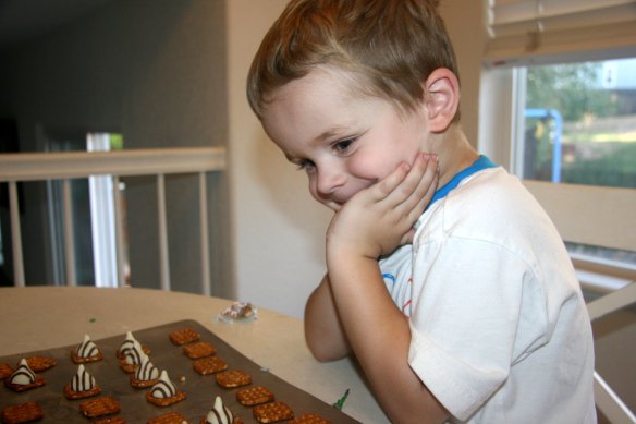 He unwrapped Hershey’s kisses and carefully placed them on the pretzels.