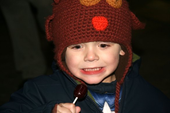 He either was not cold or would not admit to it for a long time. Finally, he wanted his coat, and then he was ready for a lollipop!