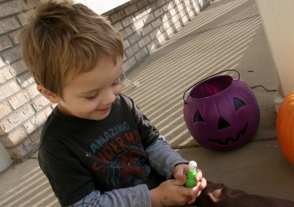On Saturday we got “booed”. Someone in the neighborhood left a bucket of Halloween candy on our doorstep. Davey thought this was just the coolest thing ever.