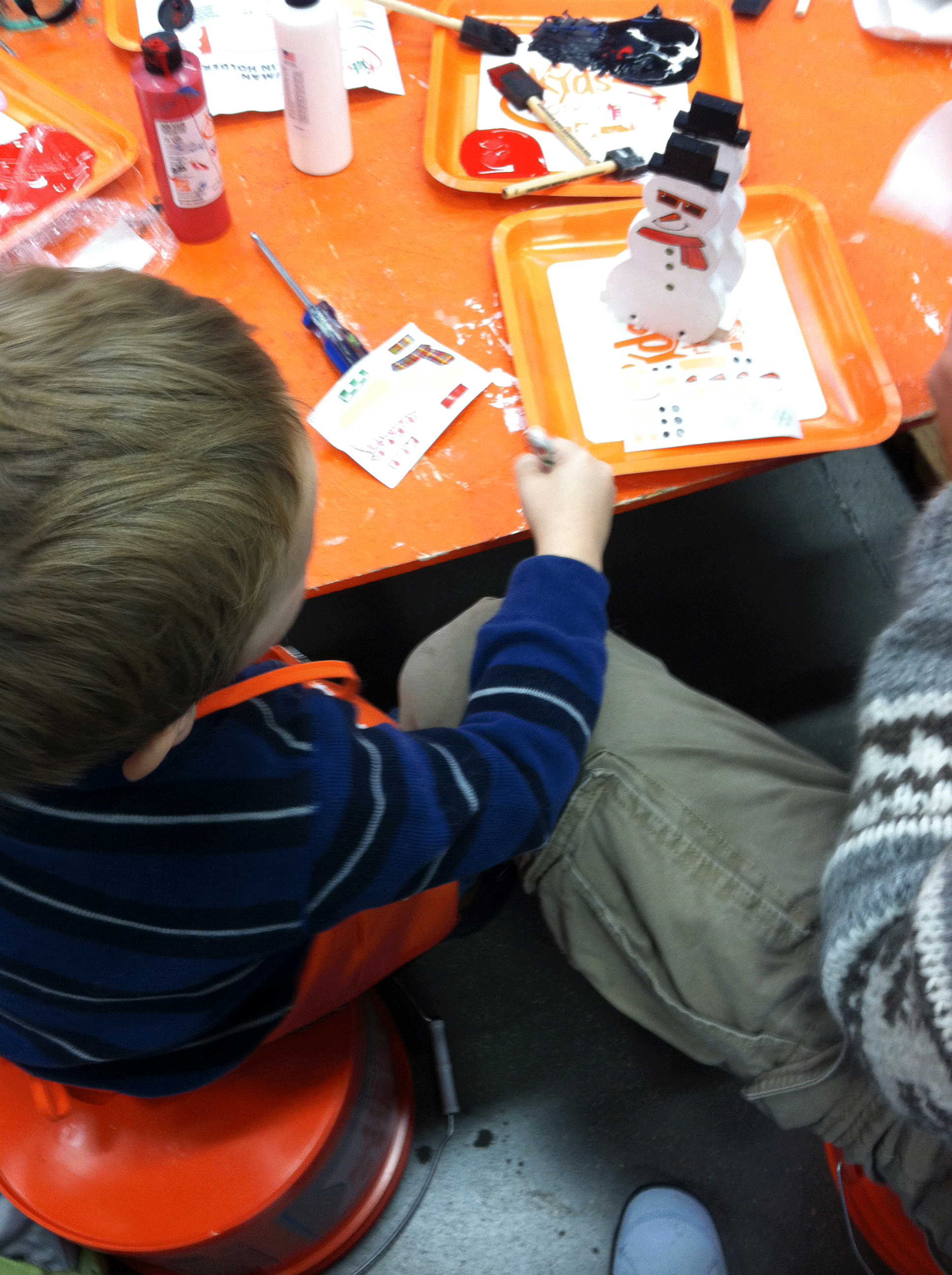 Right now, David guides Davey through much of the project. This particular project was a snowman napkin holder. I think it involved a screwdriver, paint and some stickers.