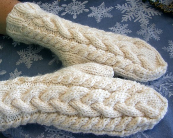 I finished my first pair of mittens last night. The pattern is called Lofty Wool Cable Mittens. I made them with Lamb’s Pride Bulky, and they went so fast. This is the same yarn that I used for David’s sweater. I had enough of the off-white leftover to make these. I was afraid that I was going to run out of yarn though. They took nearly 2 skeins. They are fairly long mittens and should be very very warm. The pattern had a stockinette wrist so that it would roll. I could just feel snow rolling into my wrists at the thought of that, so I did a 2×2 rib instead.