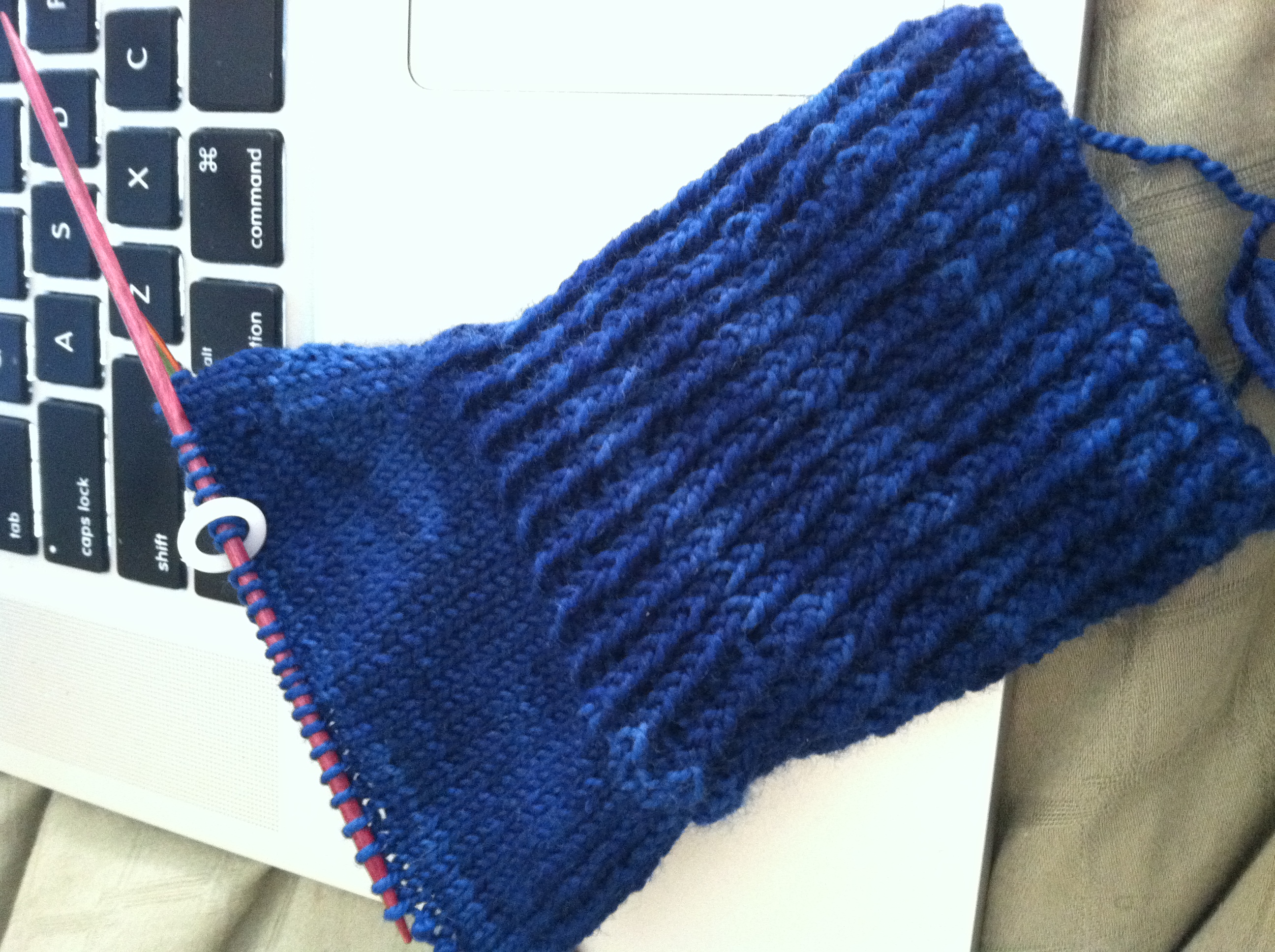 It is a fingerless glove – well it will actually have partial fingers and the flap thing that will come over the hand to make a mitten. They’re convertible mittens and the pattern is called “Podster Glove”. I am knitting with the prettiest Shibui sock yarn. Here’s an ok iphone pic.