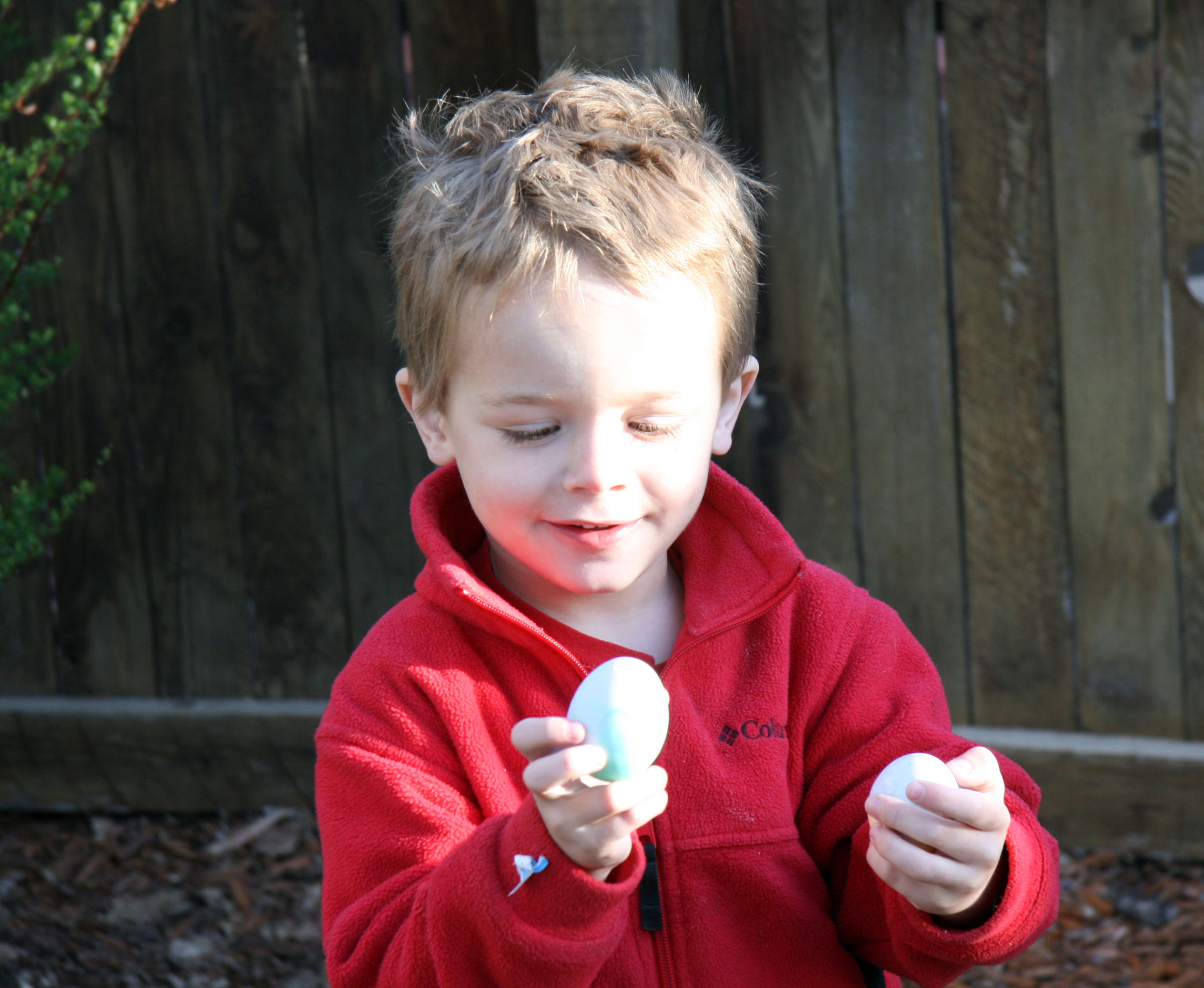 He did recognize some of the eggs that he’d already found in the backyard. He thought about this for a minute, but then just went with it. He definitely has the imagination to work this out.