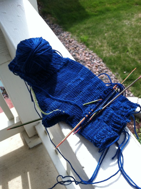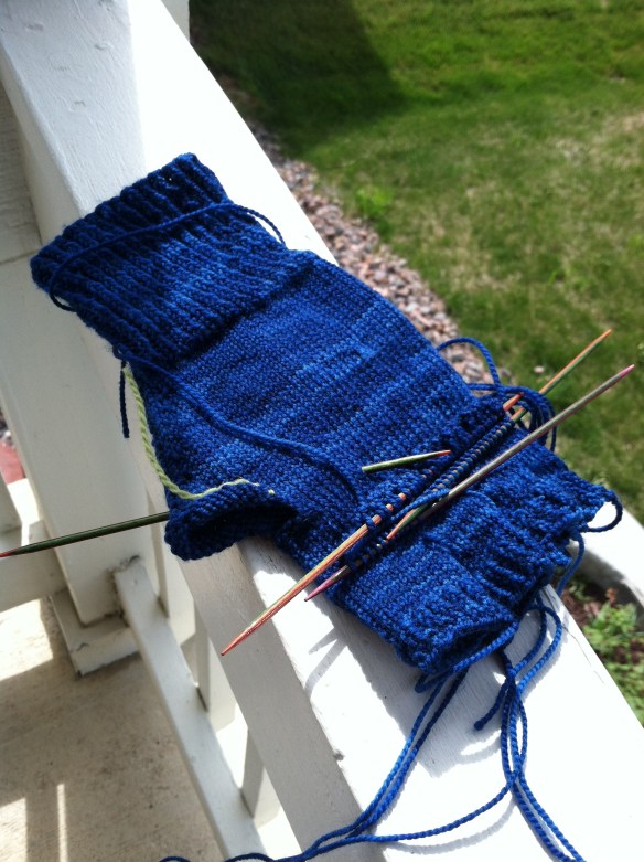 I have decided to focus on one knitting project at a time (I doubt anyone will believe this.  I don’t, but I’m going to try).  I started some Podster Gloves for a friend.  I was worried that they were going to be too big for her, so I mailed them off for a “fitting”.  She assures me that they are fine.  I still am worried that they are a little big, but I am moving forward.  These gloves have half fingers and then the optional flap you can pull over to make them a mitten. I am knitting them with Shibui sock yarn.  It’s awesome.  I love knitting with it.