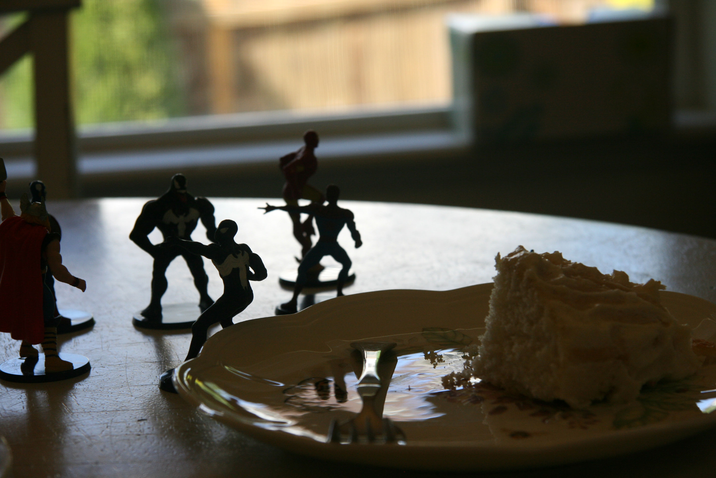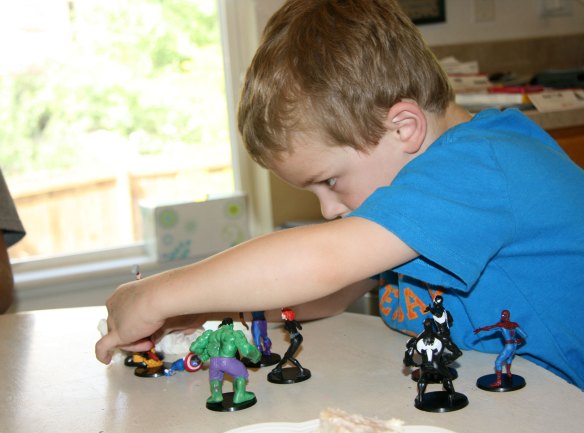 This picture of the cake and his superhero “guys” in silhouette appealed to me. I guess I like the outline of Spiderman’s outstretched hand (I think that’s Spiderman. I’ll soon be corrected if I am mistaken).