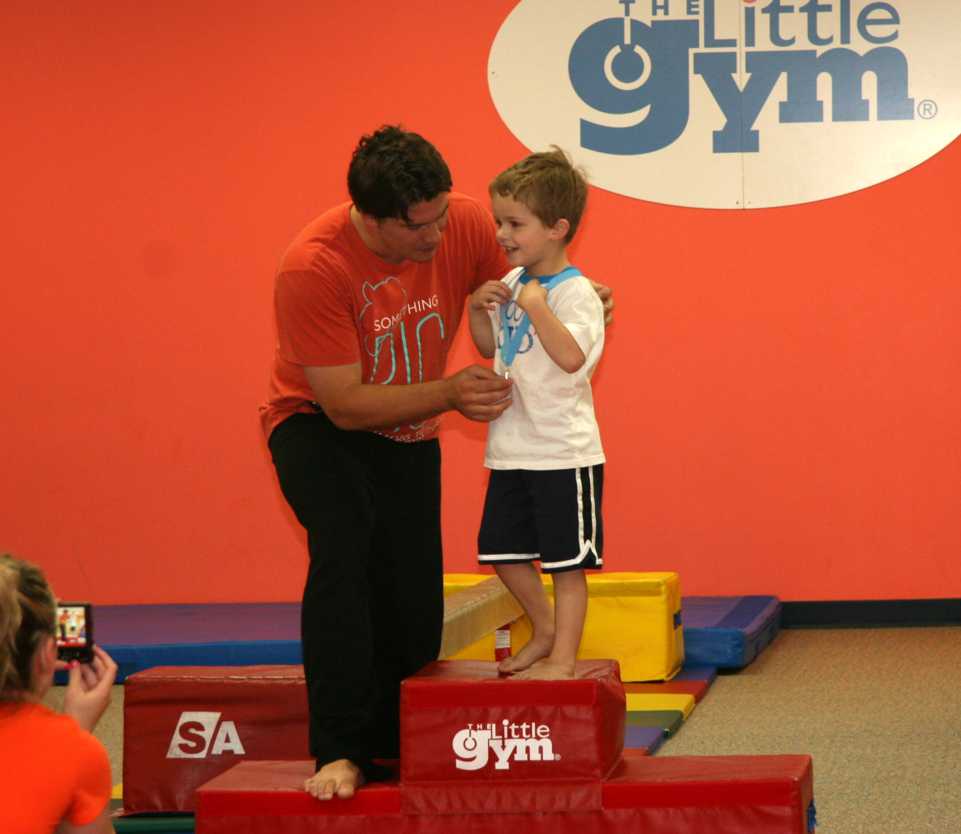 Davey had his “big shows” today at The Little Gym. He had one for his karate class and one for his Giggleworms class. He had a great time. David and I were poised with our camera and videocamera. I had to switch to my phone when the videocamera battery died (I’d not properly charged it). So we got lots of footage and some pictures. Here’s Davey with Mr. Nick getting his karate medal. He loved that.