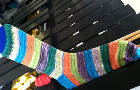 I think my favorite sock to knit is just a plain basic stockinette stitch – especially in fun yarn – or especially like with this sock where I changed colors every ten rows.