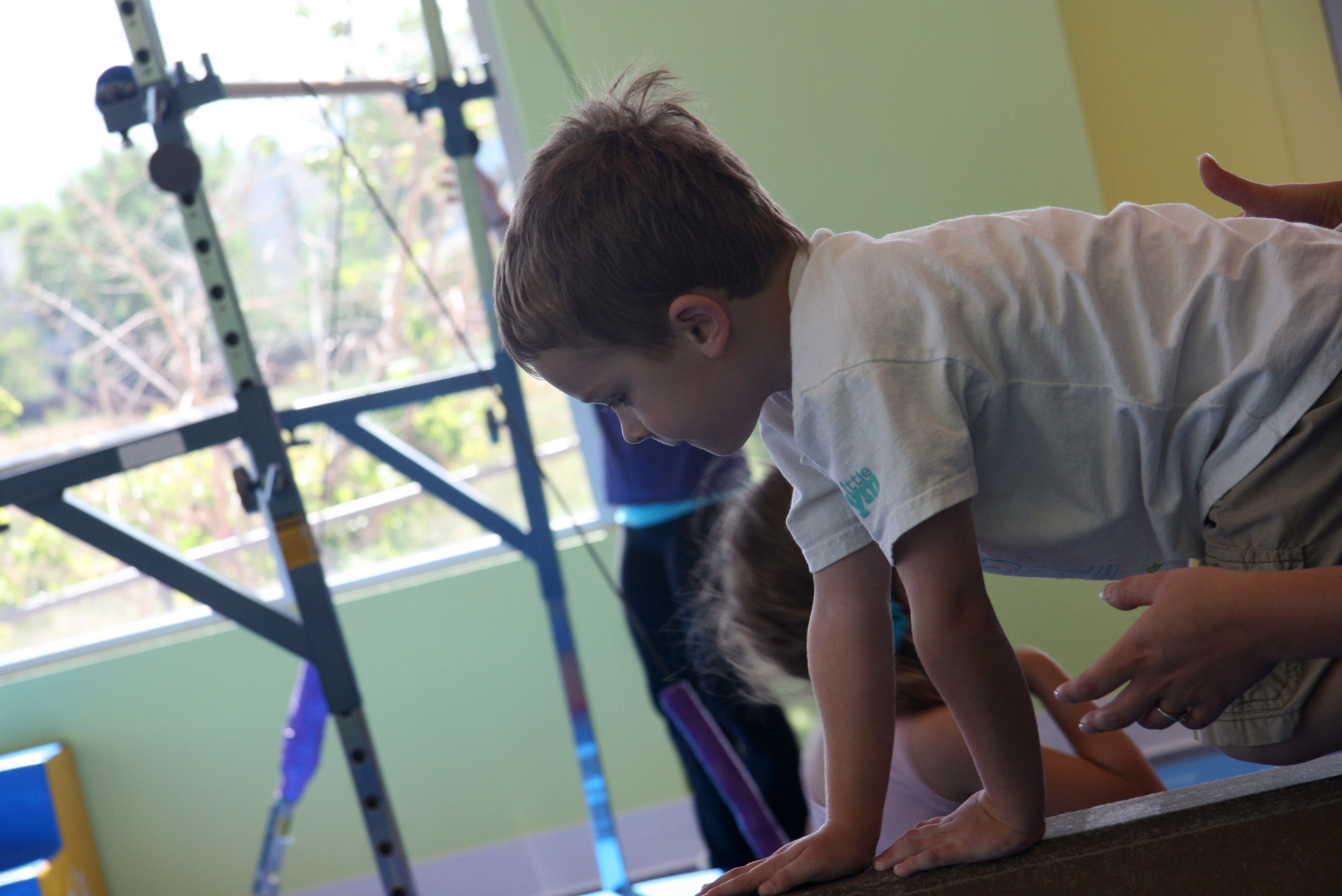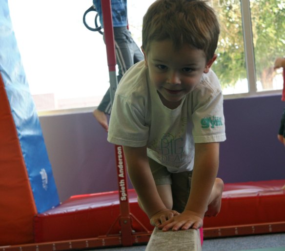 He was in the mood to crawl. First he had fun crawling across the low beam.