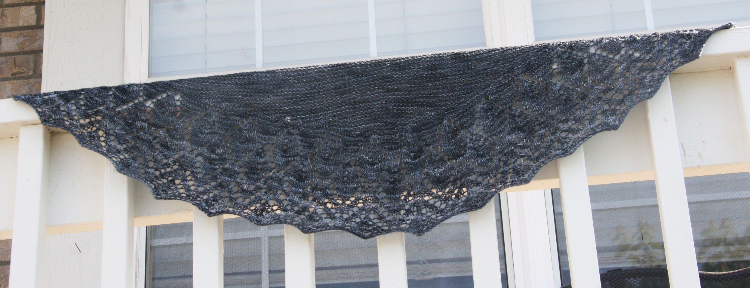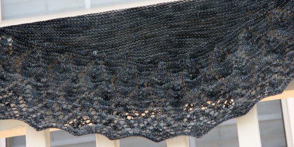 I finished “Ione” the other day. It was a crescent shawlette pattern, and I knitted with a great yarn that I’d not tried out before. It’s called Prism Saki and I got it when I was visiting my friends at Knit Unto Others in Arkadelphia. It was so nice to knit with. This pattern was great too. It has a lace edging and then garter stitch. The garter stitch is done in many short rows for the shaping.