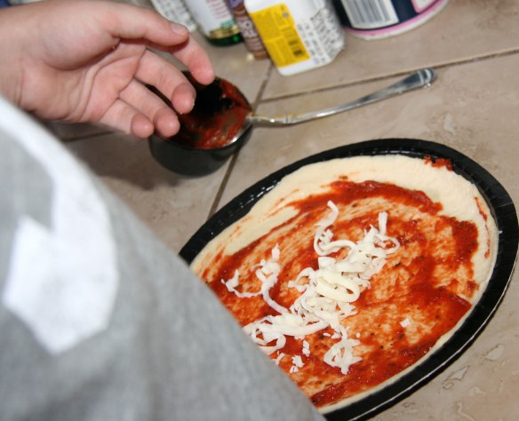 Davey finished up the summer reading program today.  He enjoyed turning in his record of the books we’d read.  One of the rewards was for a mini pizza kit from Papa Murphy’s.  He was very excited about this.  He could not wait to get home and make it.