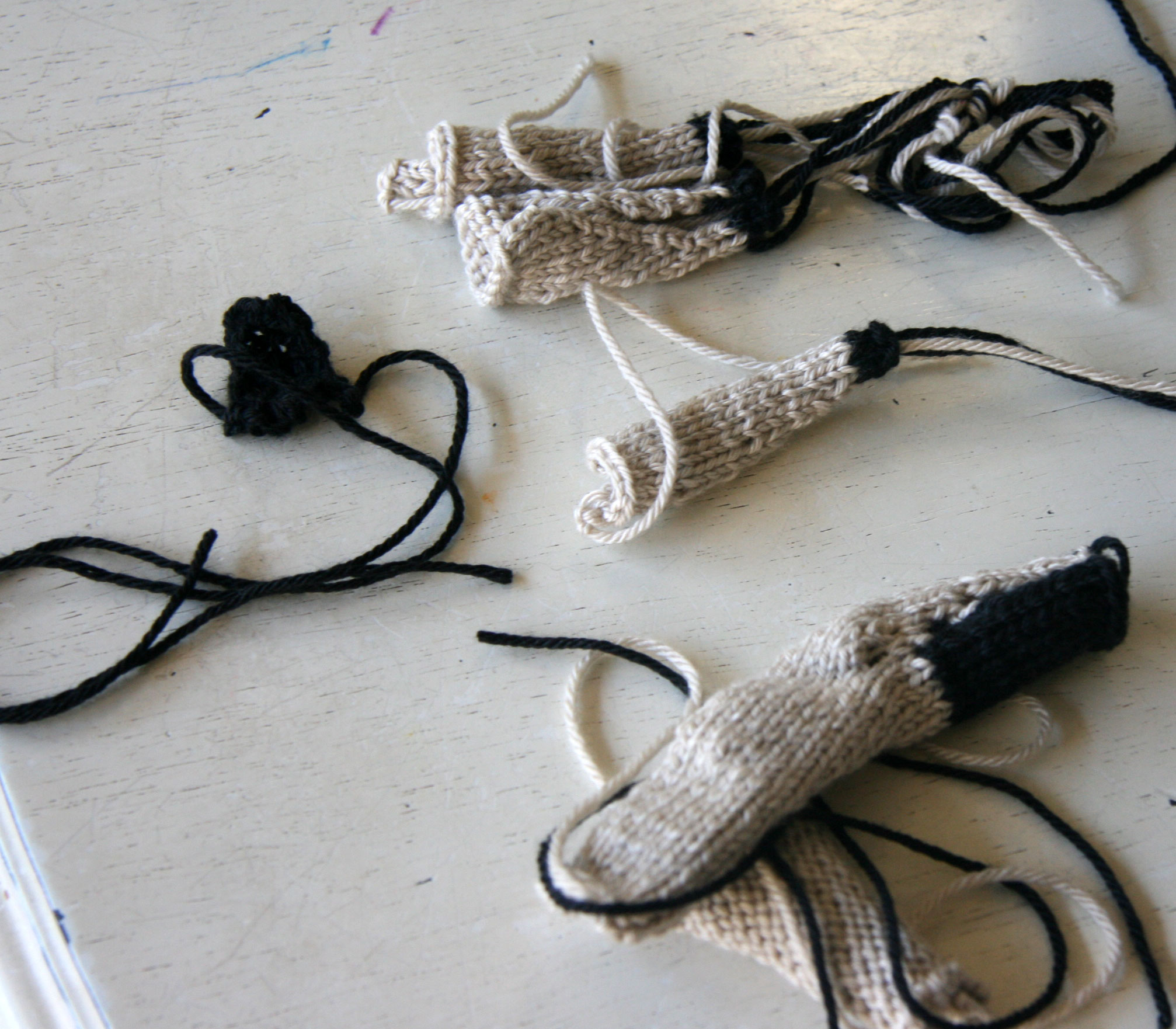 These are not all the pieces. There are two ears, two eyes, two front legs which are knitted a little differently than the two back legs, a right side body/head piece, a left side body/head piece and a tummy tail piece (which is a long piece which will extend from under the chin to the tail.)