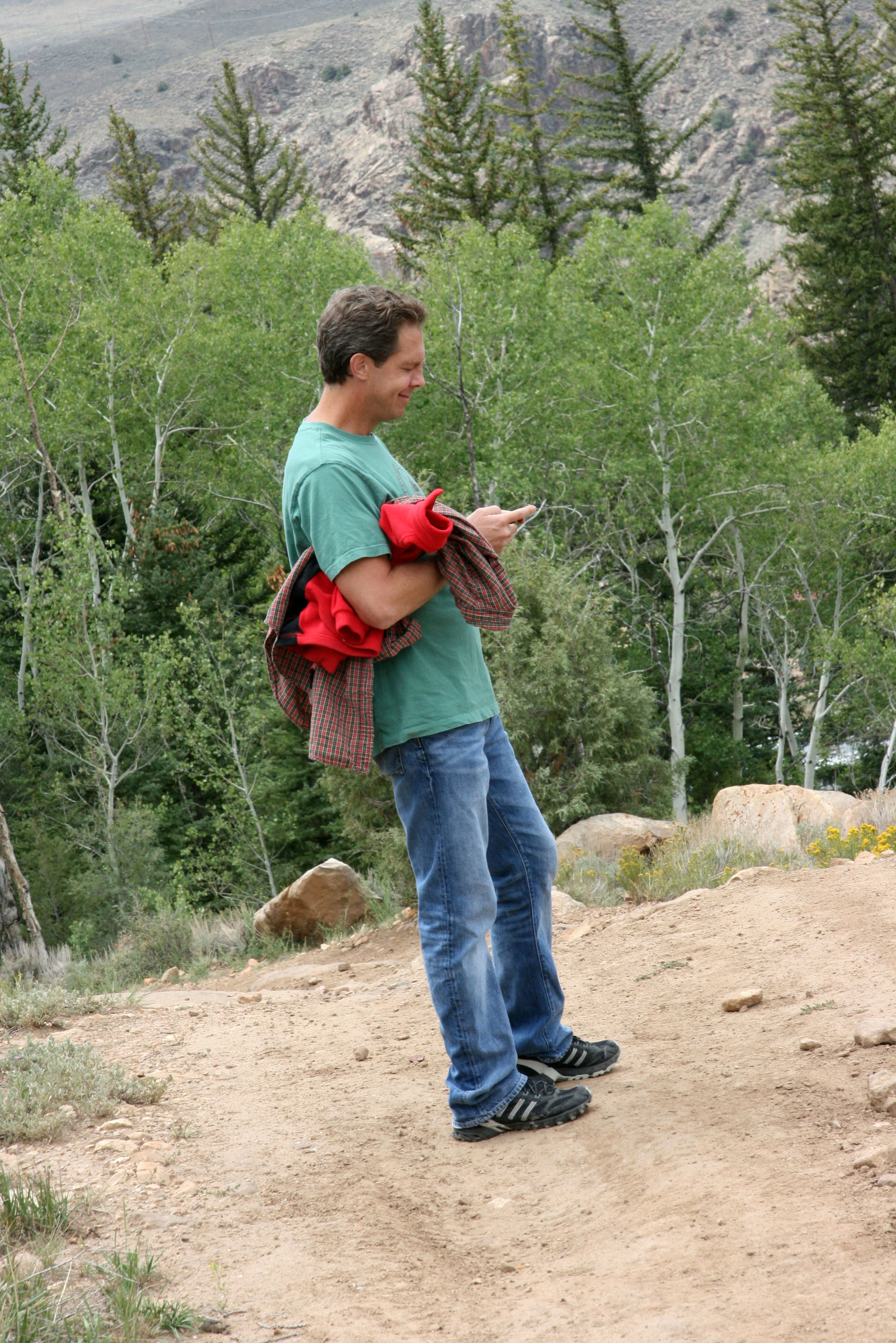One day we went on a short hike behind the cabins. I have to say that Davey was “Mr Cranky Pants” deluxe, and he didn’t really want to go. But then he began to have fun. We didn’t go far, but it was an uphill climb. Ok well this picture is the view looking back down!