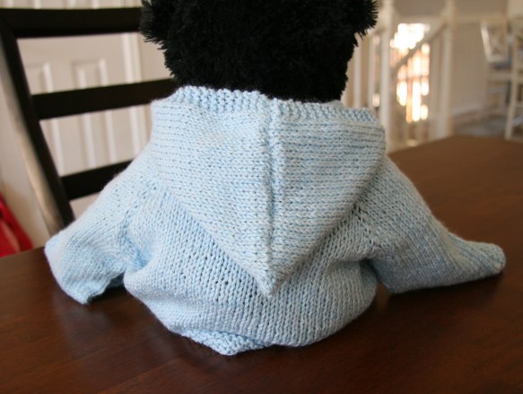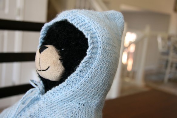 This is a free pattern called Easy Baby Cardigan by Diane Soucy. I didn’t have a sweet 6 month old baby to model this on so Winkie The Rock Star Bear served as my model.