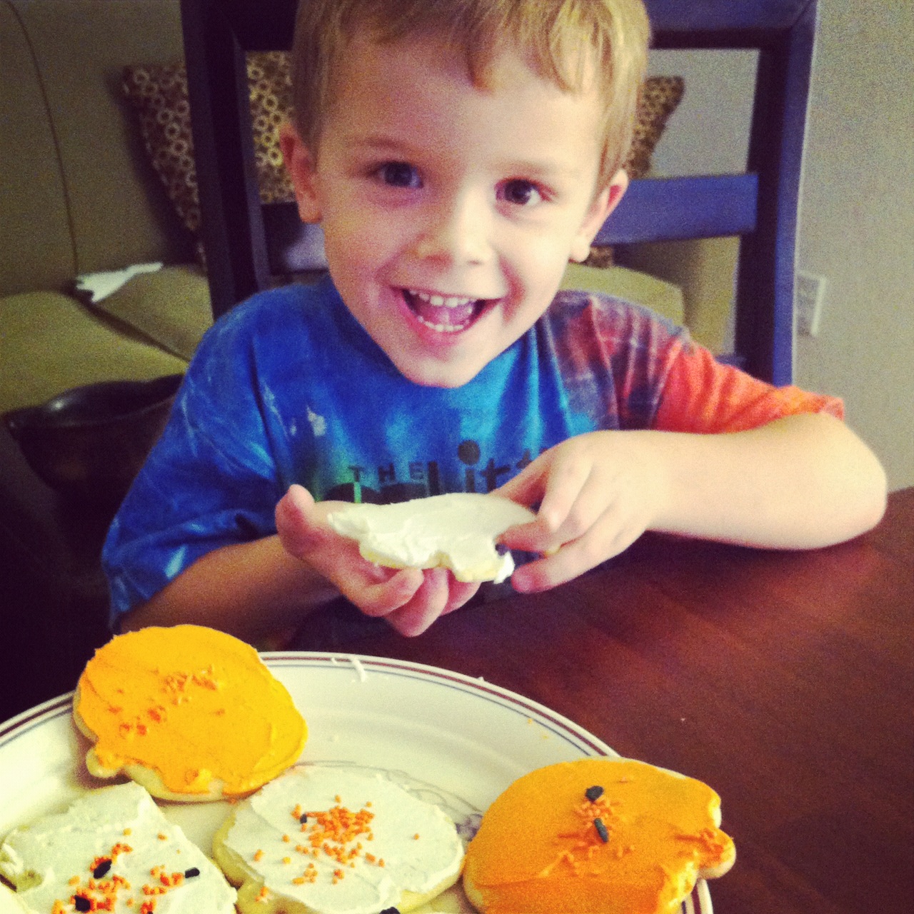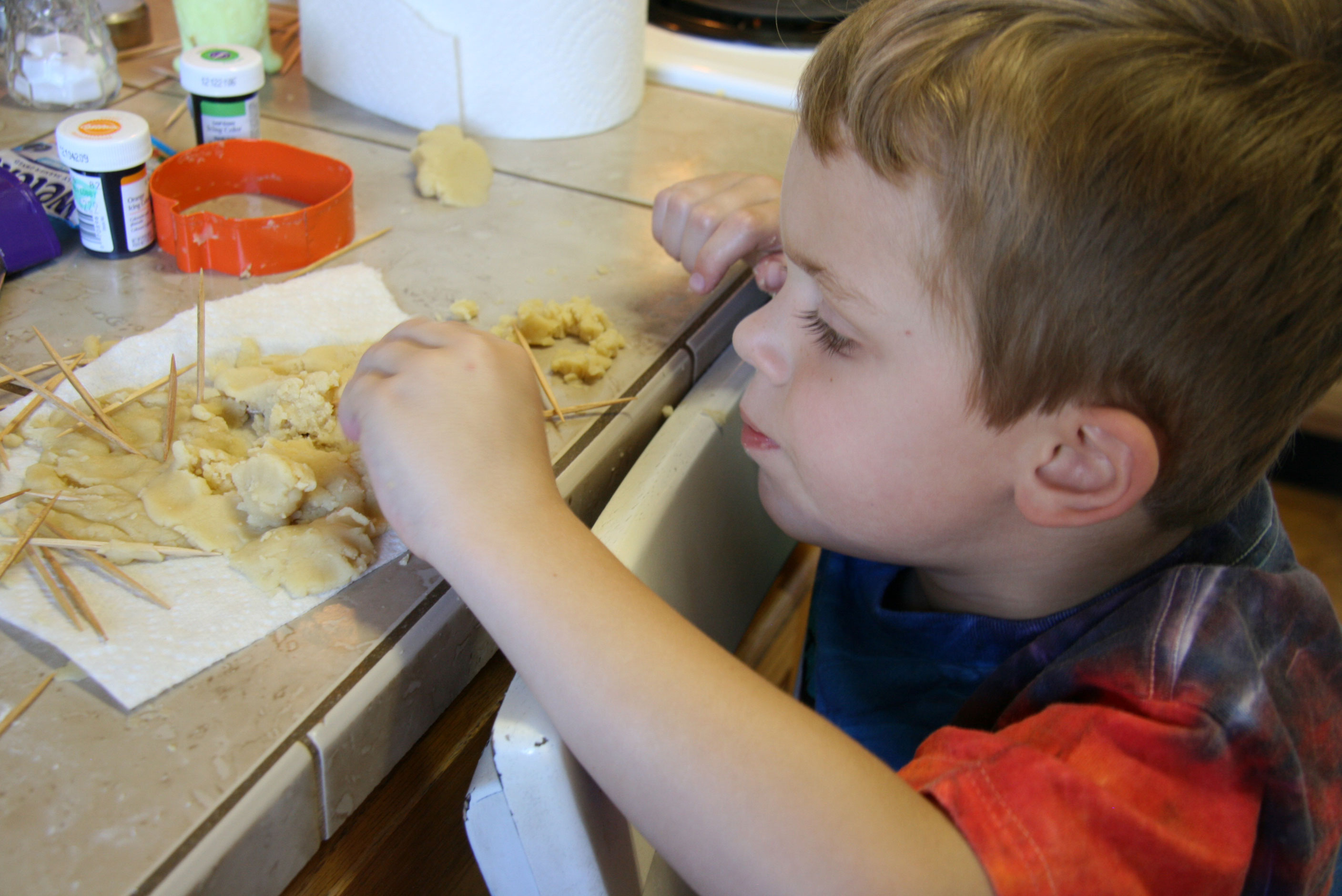 We did buy some Halloween cookie cutters yesterday, and we made our first batch of Halloween cookies. Davey helped me cut some of the dough out, but then he decided to take leftovers and play with them. Next thing I know he has gotten the toothpicks and is totally absorbed in some story he created with the dough and toothpicks. It’s not real pretty, but he had the best time:
