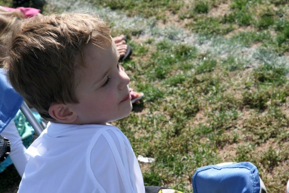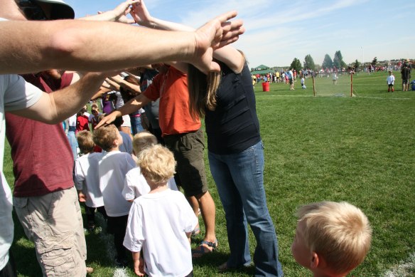 At the end, it was time for the parent tunnel.  The little boys all ran through, and you can see Davey getting a pat on the head from another parent.