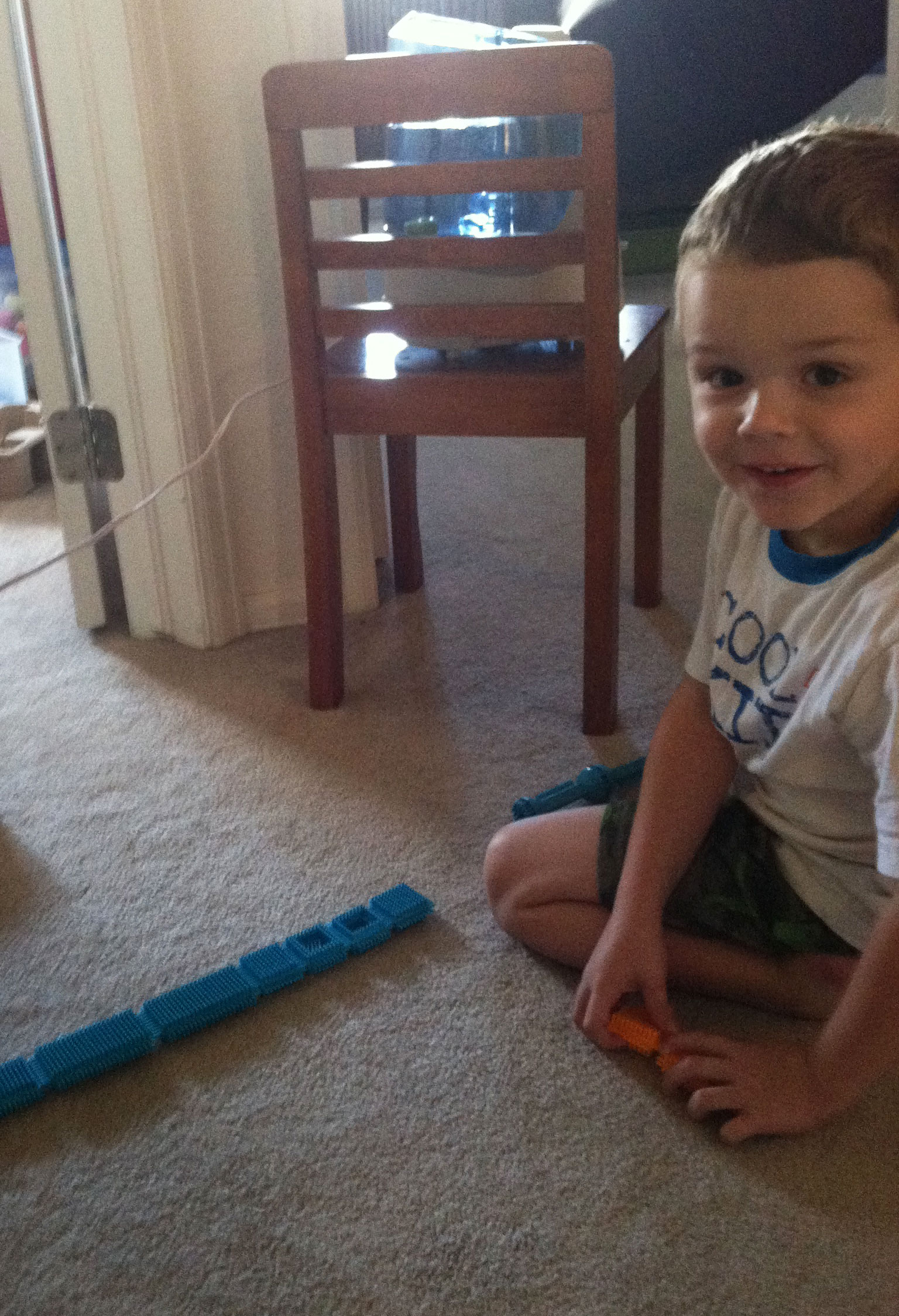 The third is the line of blocks on the floor. Davey was creating a “love sculpture” for me. It has to be a very long line because he has lots of “words of love” to say. It is very sweet. He also made me a shorter one to take to school with me.