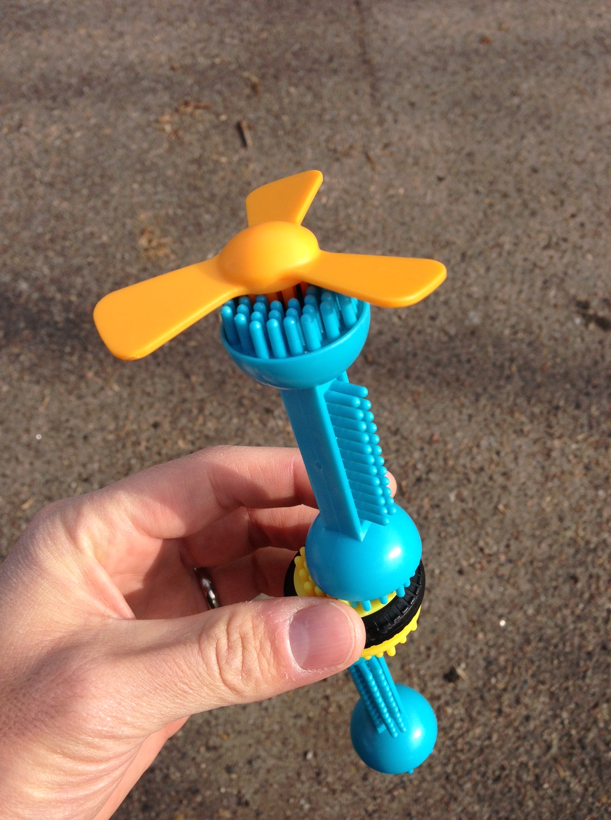 This sculpture also had a specific purpose. Davey was very excited about “Derby with Dad” day at prek today. The dads go and they race Derby cars I think. It’s getting ready to take place in just a few minutes. So Davey wanted to help David be on time and he said, “Daddy when the propellers start spinning” that is when you need to leave RMCAD to come to Derby Day.” So David took it with him to school. Such an imagination. I love it.