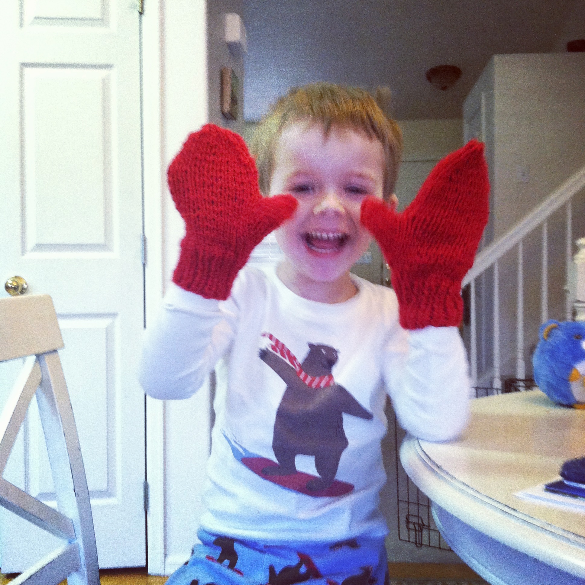 It turned out ok because Davey really wanted red mittens anyway. So I made him some red ones. They are actually just a little big, but he really likes them. This picture is blurry, but I like Davey’s grin and the way he is showing the mittens.
