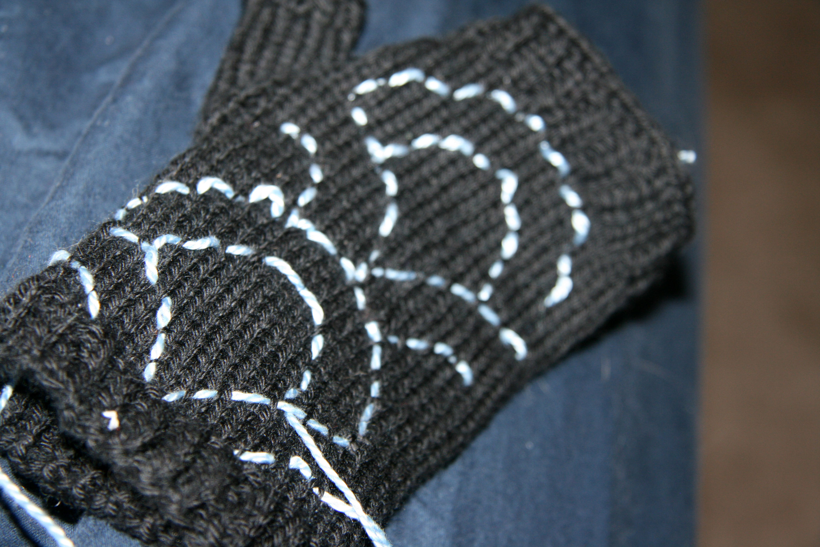 I’ve been trying to figure out how to incorporate embroidery into my knitting. I embroidered on some fingerless mittens awhile back, and I kinda liked how they turned out, but I wanted to work on this some more.