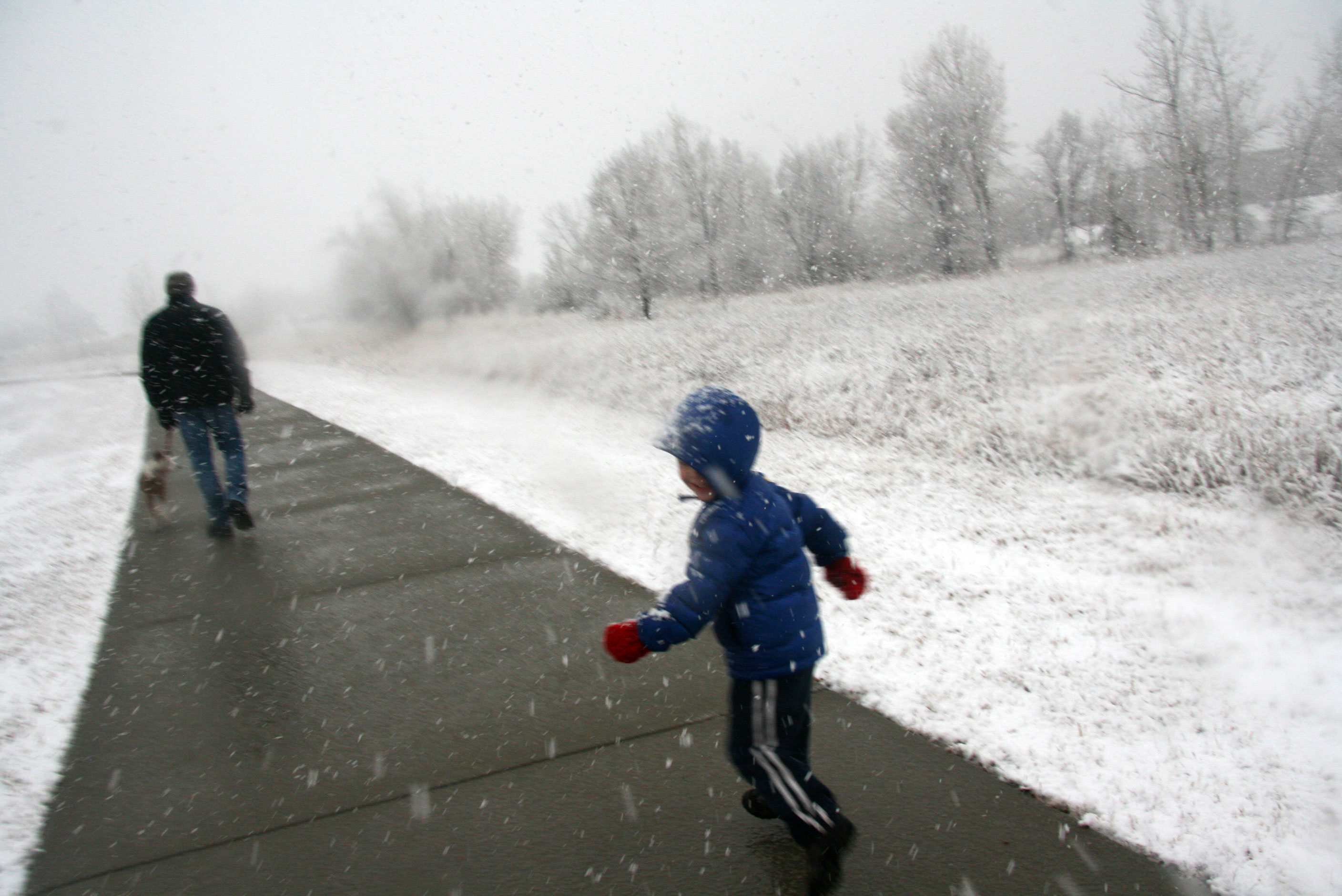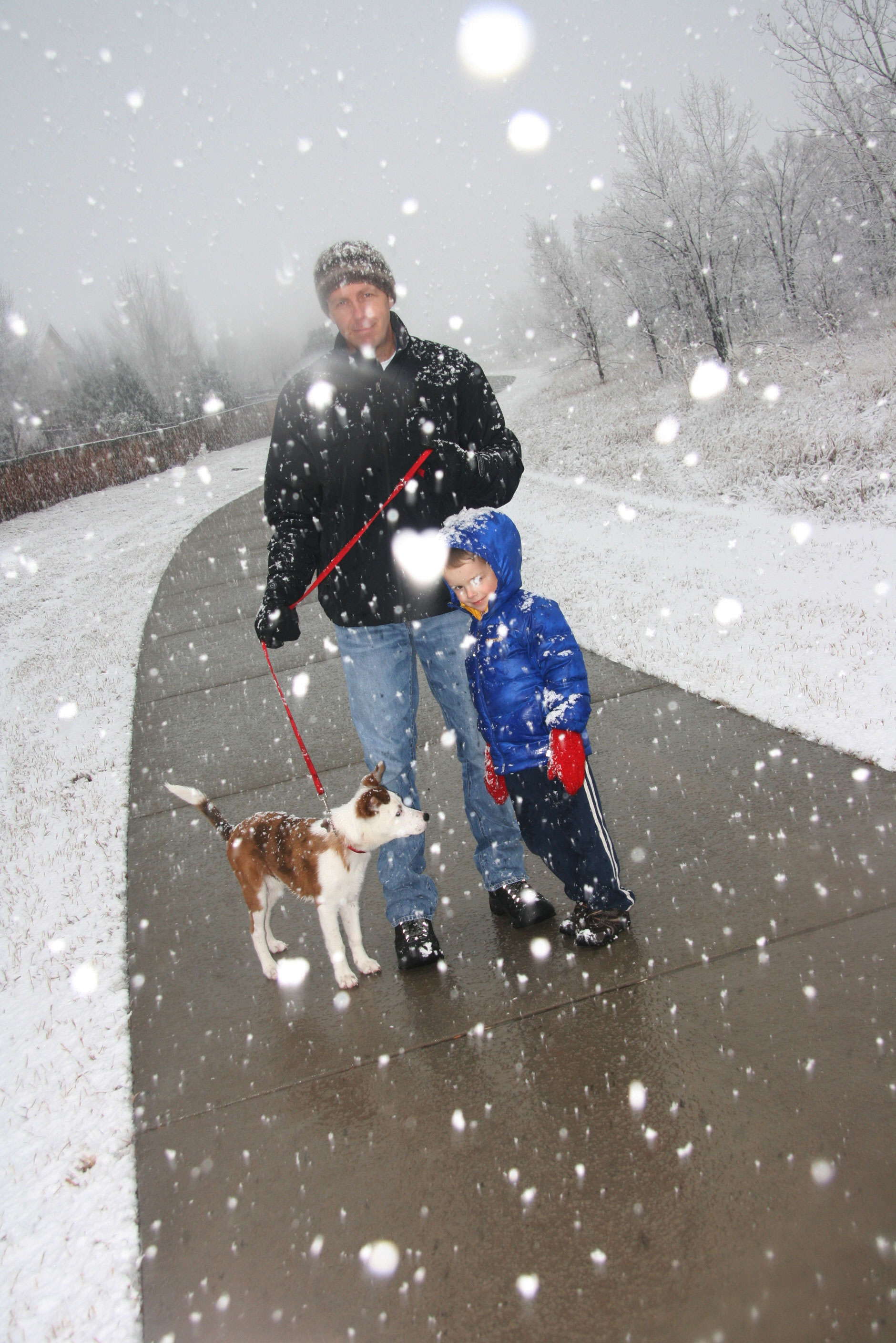 Davey, Buster and I headed outside and luckily just as we were headed out to walk around, here came David – home from school! Love the big flakes in this picture.