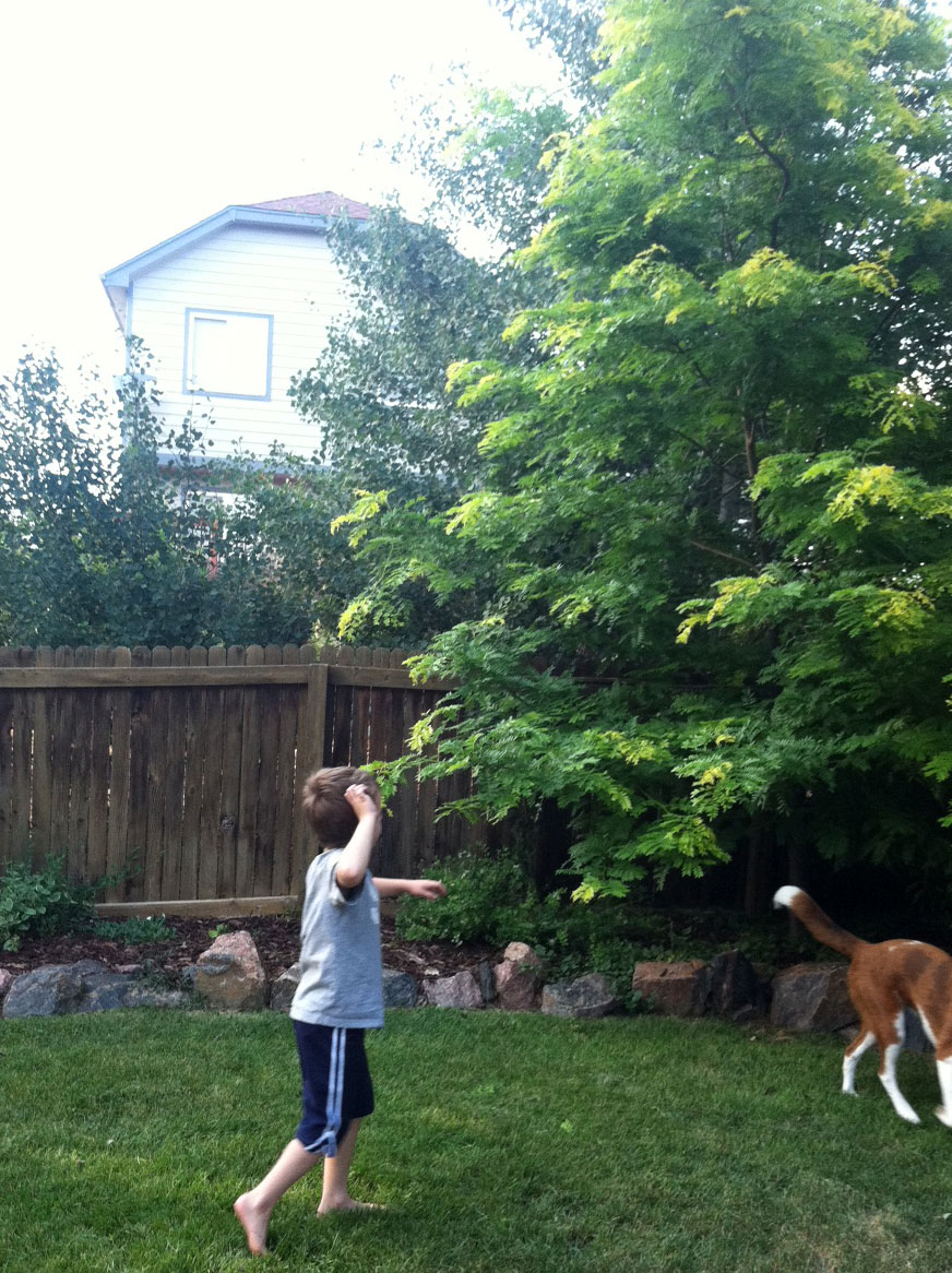 This evening it has been so pretty and comfortable outside. I sat on the deck and worked on some knitting. We played with Buster and Davey did some pretending. He (as Harry) is battling the “whomping willow” here.