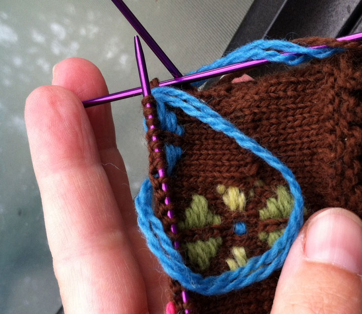 You pull the colored yarn forward and make what they called a “hanging flap”.  Then you knit the stitch or two and just pull that yarn to the back.  The part that covers the front stitch stays in the front.  That doesn’t make a heck of a lot of sense.  The video explains it better.