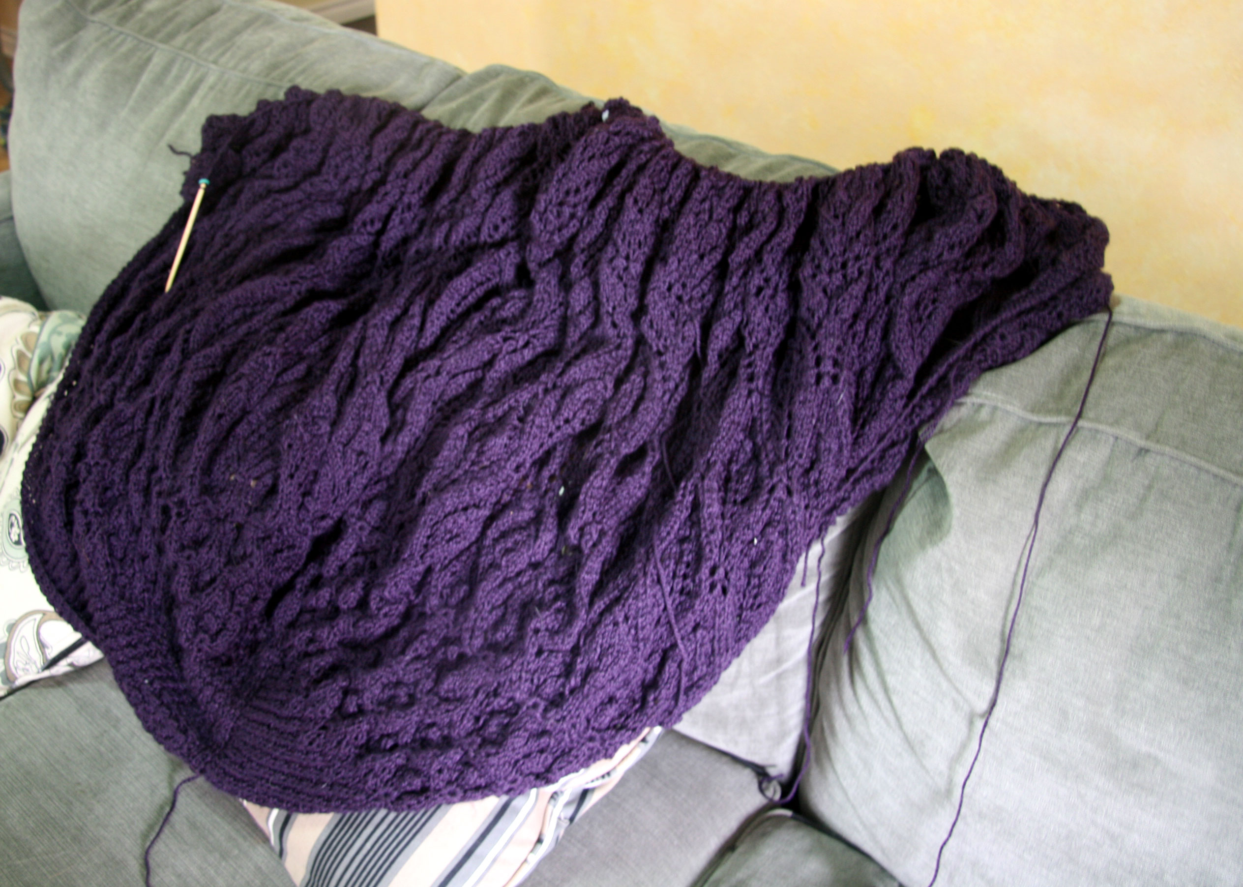 My Regrowth Shawl is slowly approaching bind-off. I have now begun referring to it as “the behemoth”. It’s enormous. It’s been a great pattern, and I have loved knitting it. I have 8 rows to go, and I ran out of yarn again. It’s so large at this point, that I ordered 4 balls of yarn. It might take that to finish those 8 rows. Maybe it will just take 2 or 3, but I didn’t want to have to order it again. I wish I could take a good picture, but lace in progress just doesn’t photograph well (at least in any way that I know how to do it).