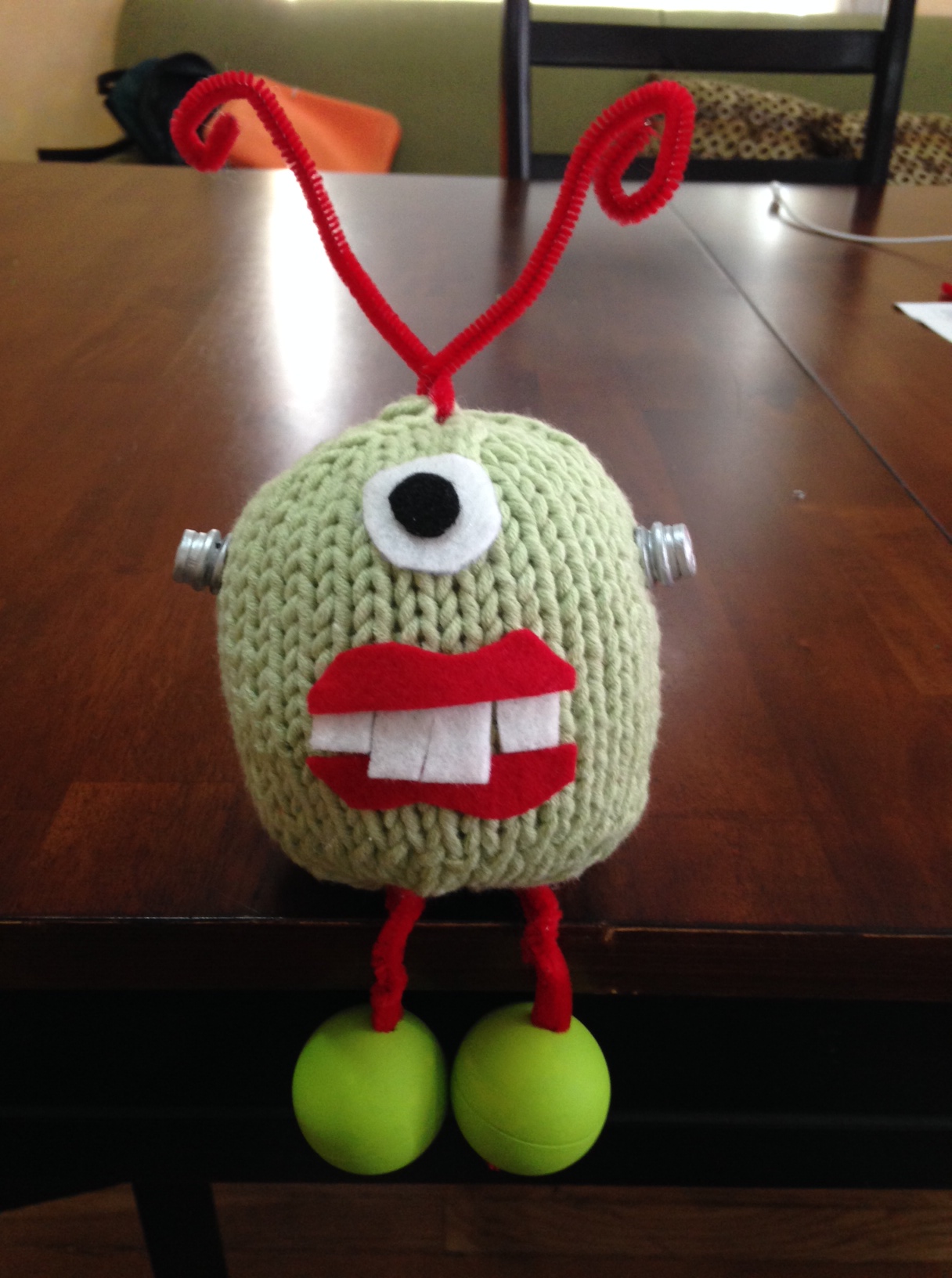 I decided to put my knitting skills to work. I used the Rebecca Danger Monster Chunk pattern to make the body. (I used a bulky cotton that I had.) We used ping pong balls for the feet. The pipe cleaners worked great for legs and antenna. Then I glued together several buttons and painted them for his ears (I guess those are ears?!). Davey helped me design his felt face.