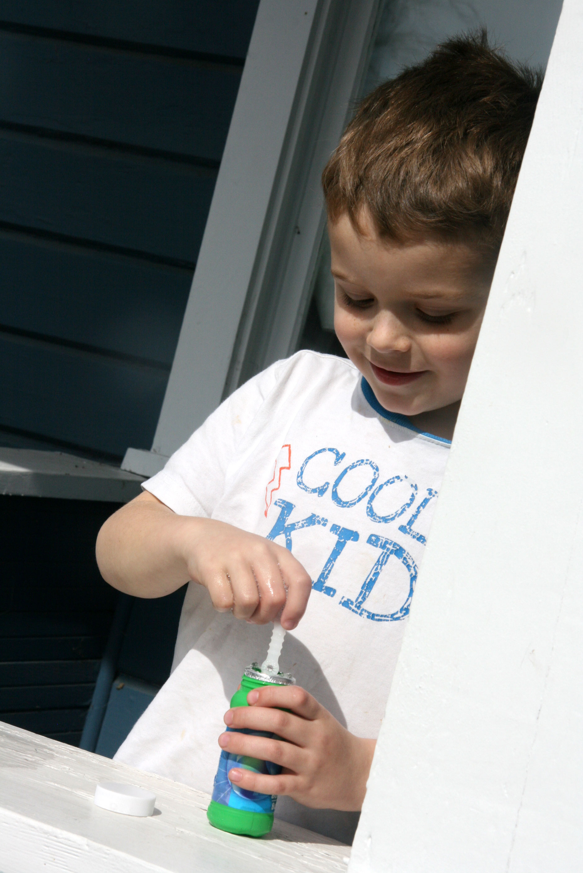 We picked up a large bubble wand at the Dollar Tree. Davey was really working at making big bubbles.