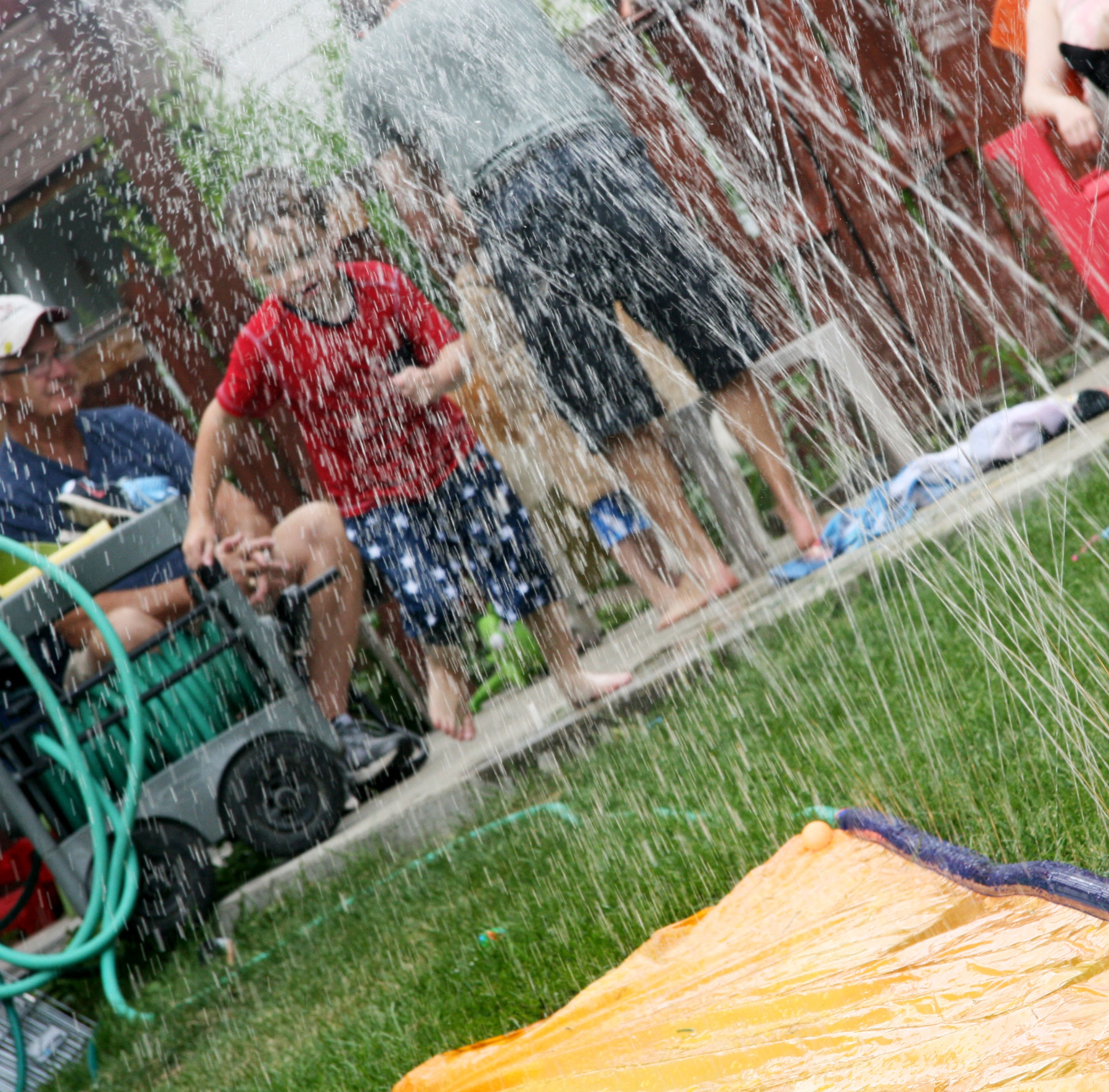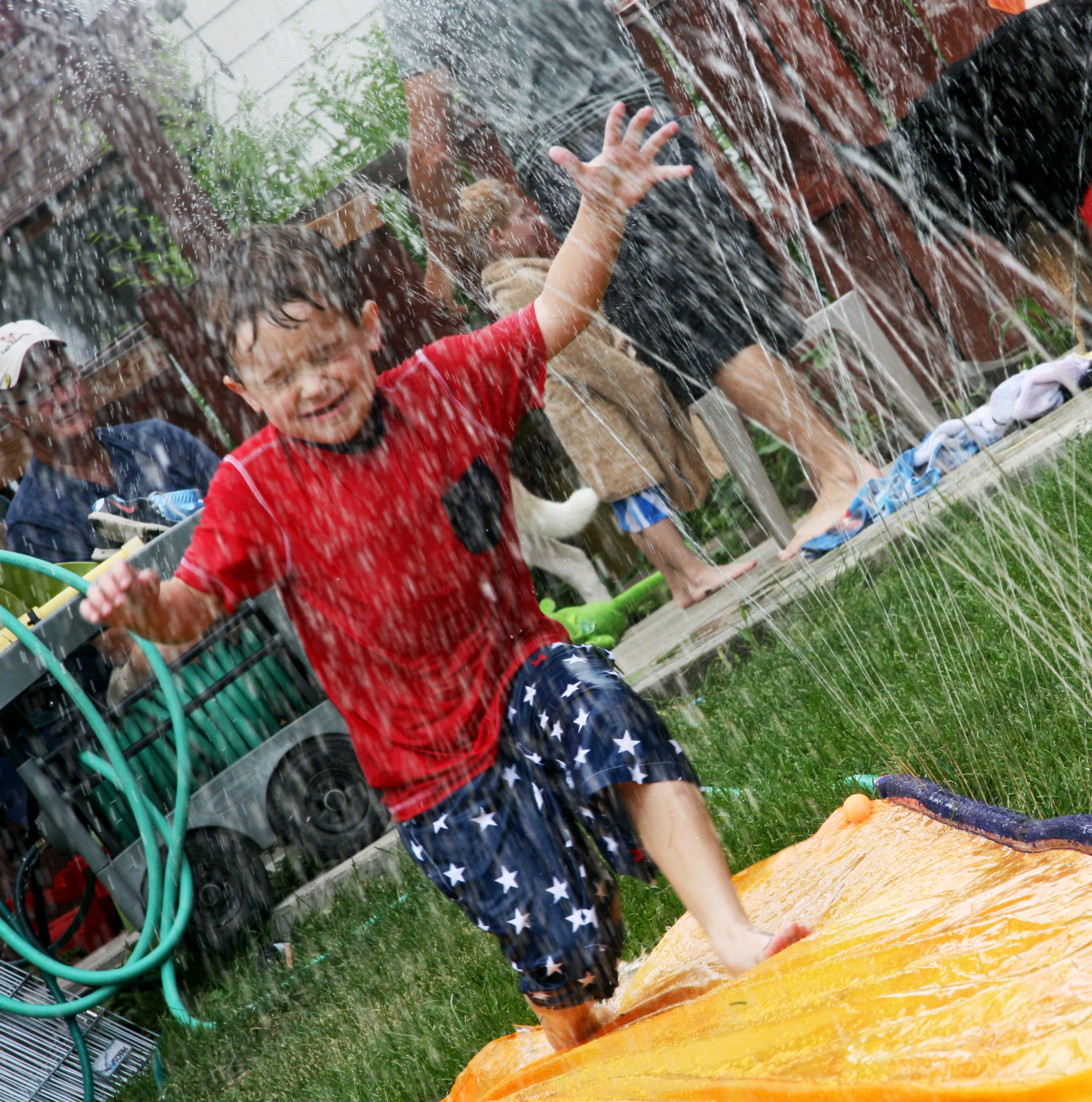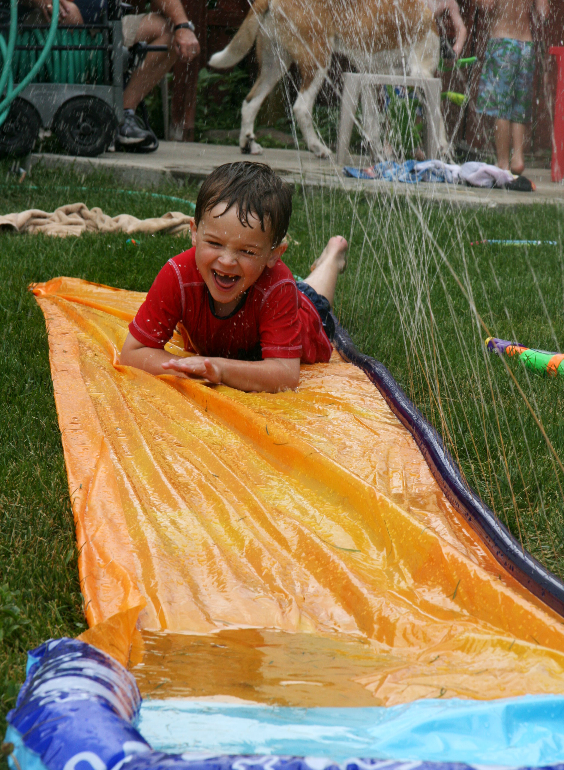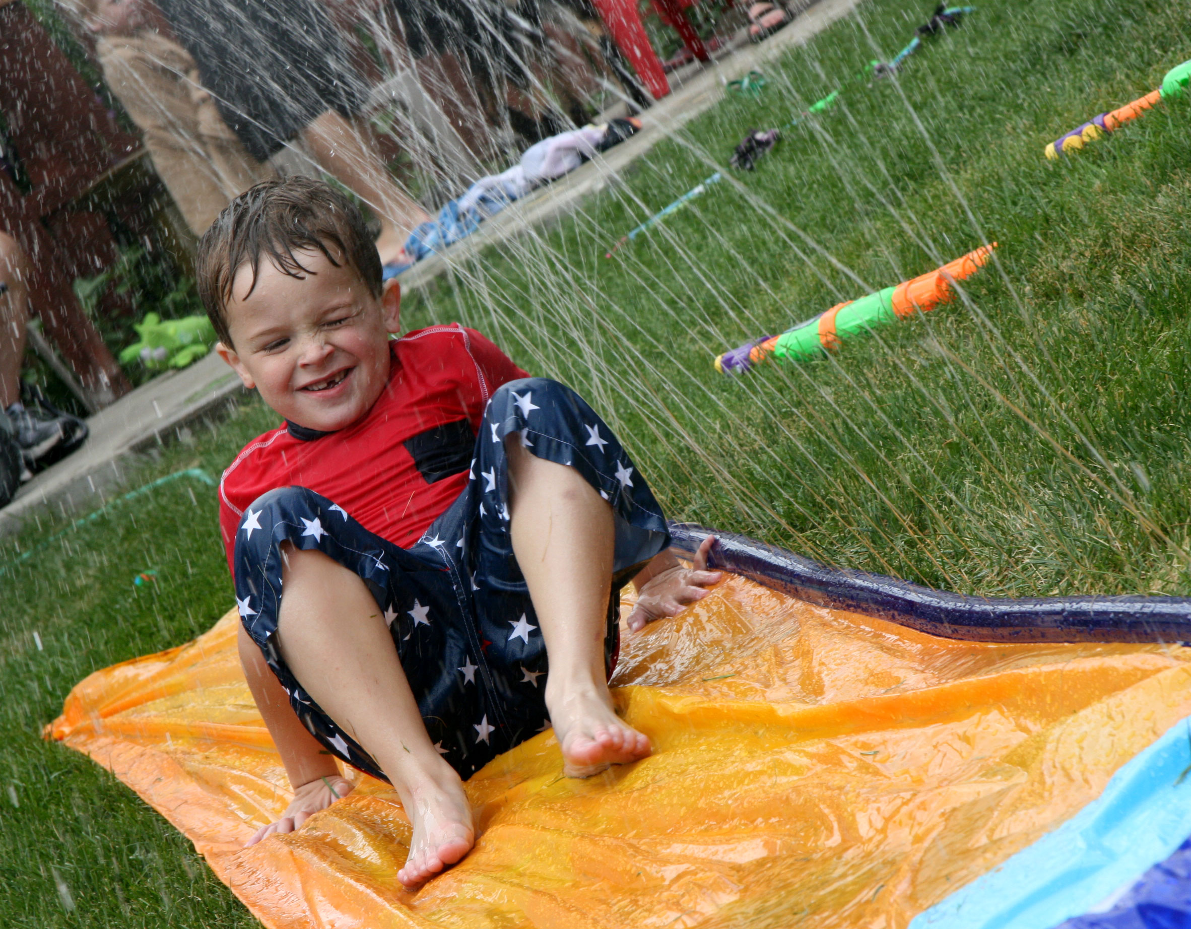 Davey had such a fun time at our neighbors’ house today. He and two other little boys played in the kiddie pool, shot their Dollar Tree water tube pistol things (awesome dollar spent!), and slipped down the slip and slide.