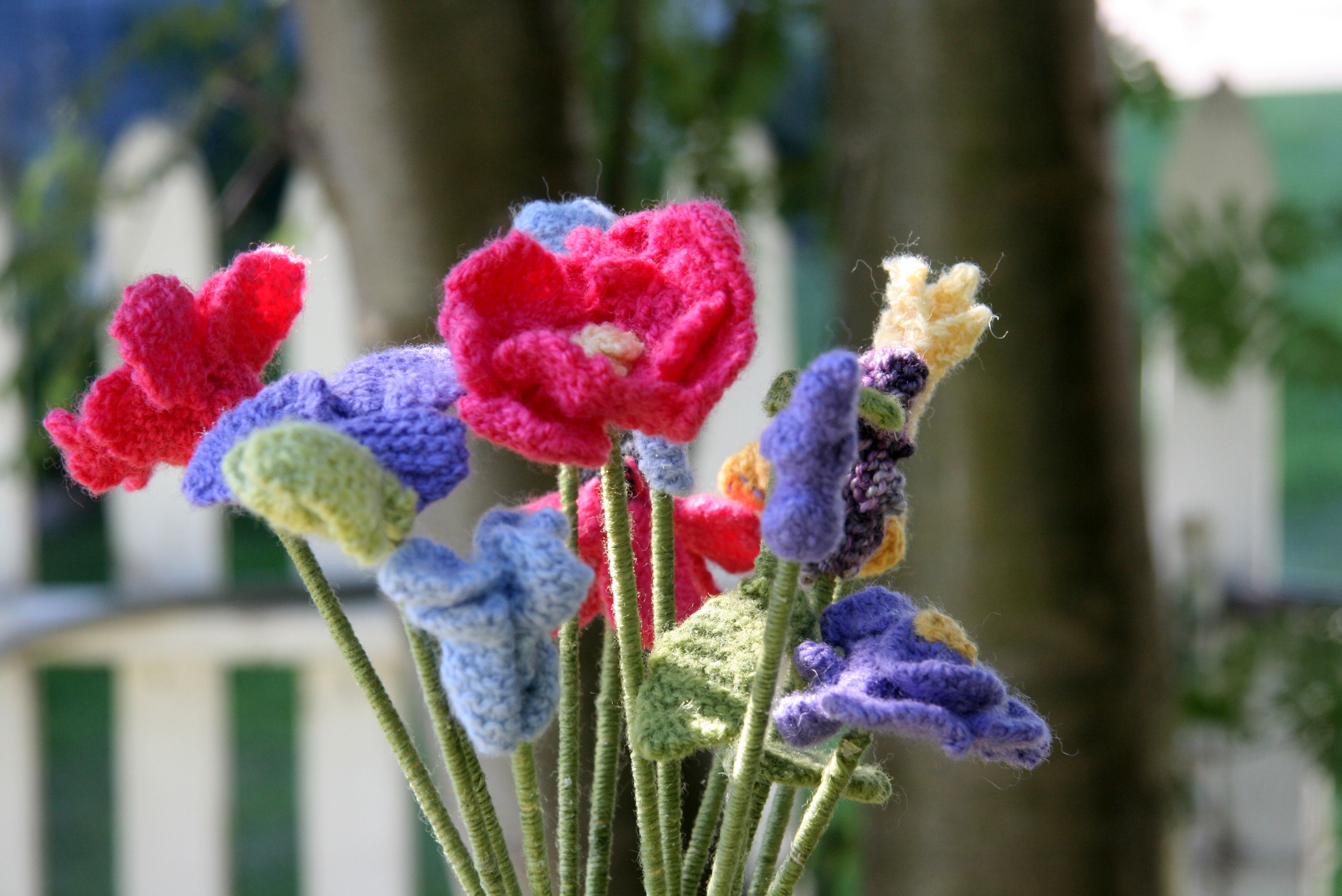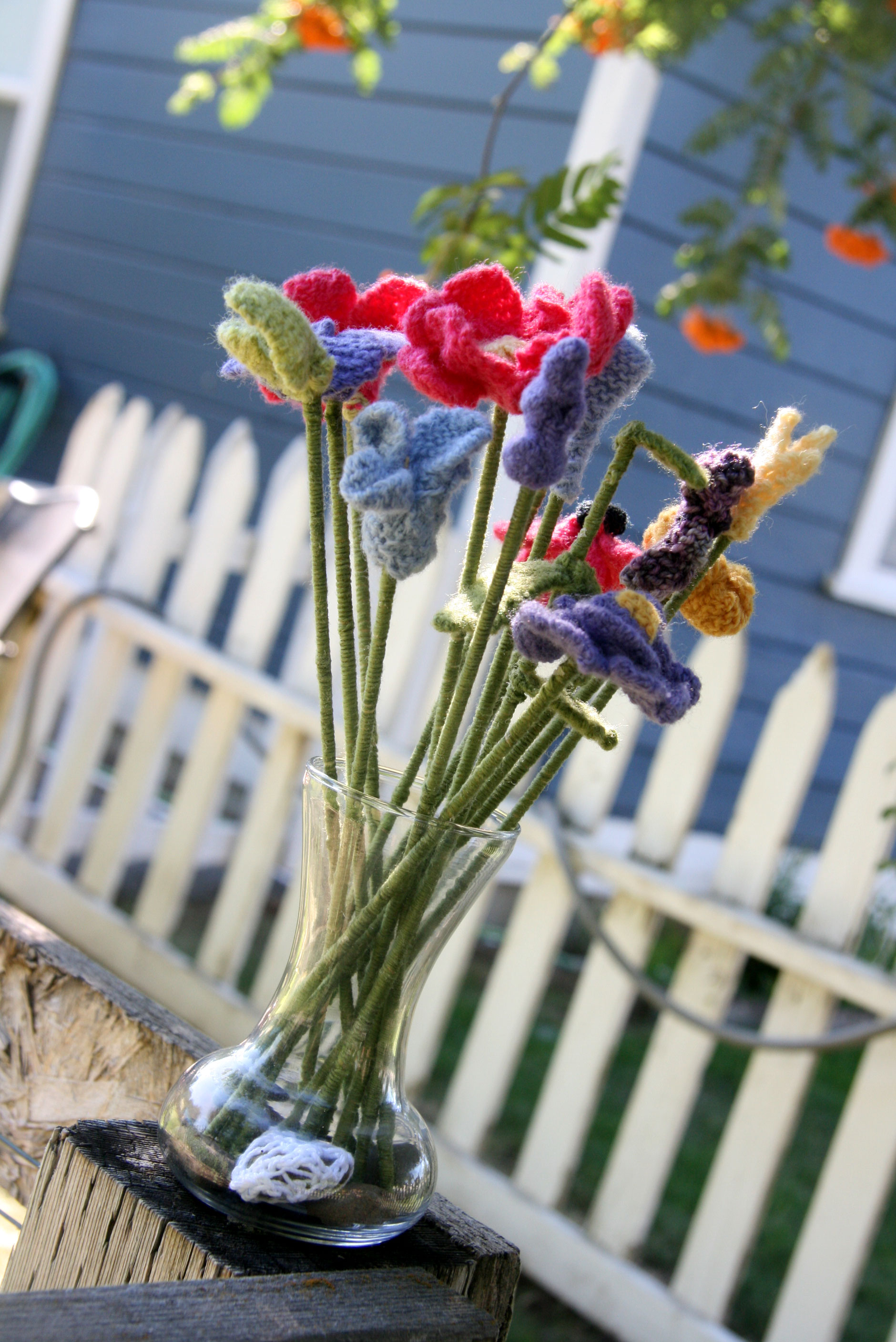 I put the flowers away for awhile. Then the other day, I saw a picture of knitted hearts which had bamboo skewer stems.