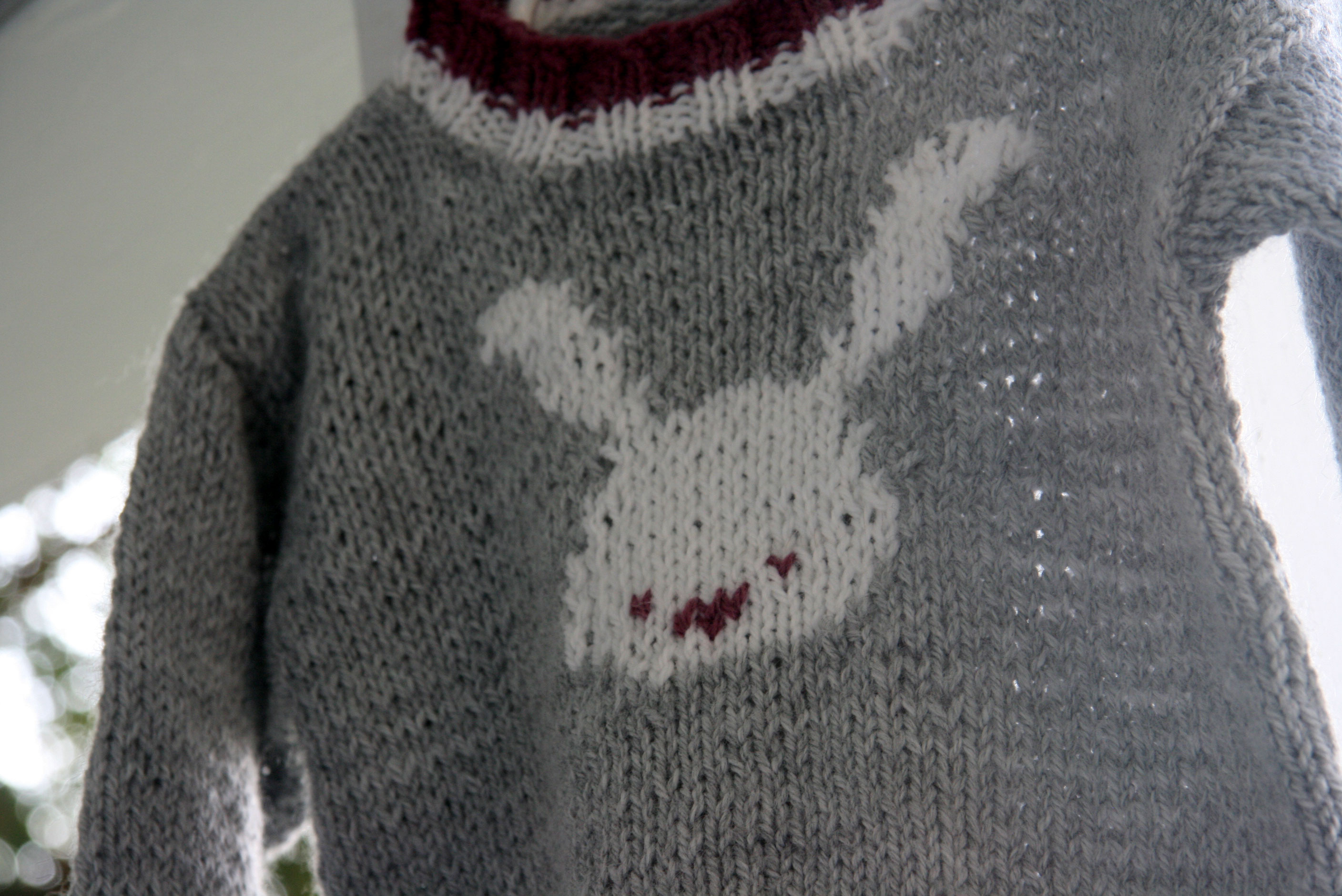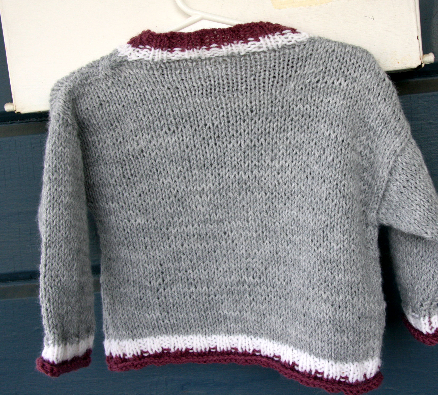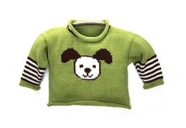 This was my first attempt at intarsia! I wish I had a little human on which to model it, but I couldn’t quite squeeze it over Davey’s head! It’s a 12- month size, and it’s really a great sweater pattern. I’d highly recommend it for both a first sweater and a first intarsia project. The pattern is from Roo Designs. She has lots of really cute patterns. Puppies, peace signs, penguins – all intarsia.