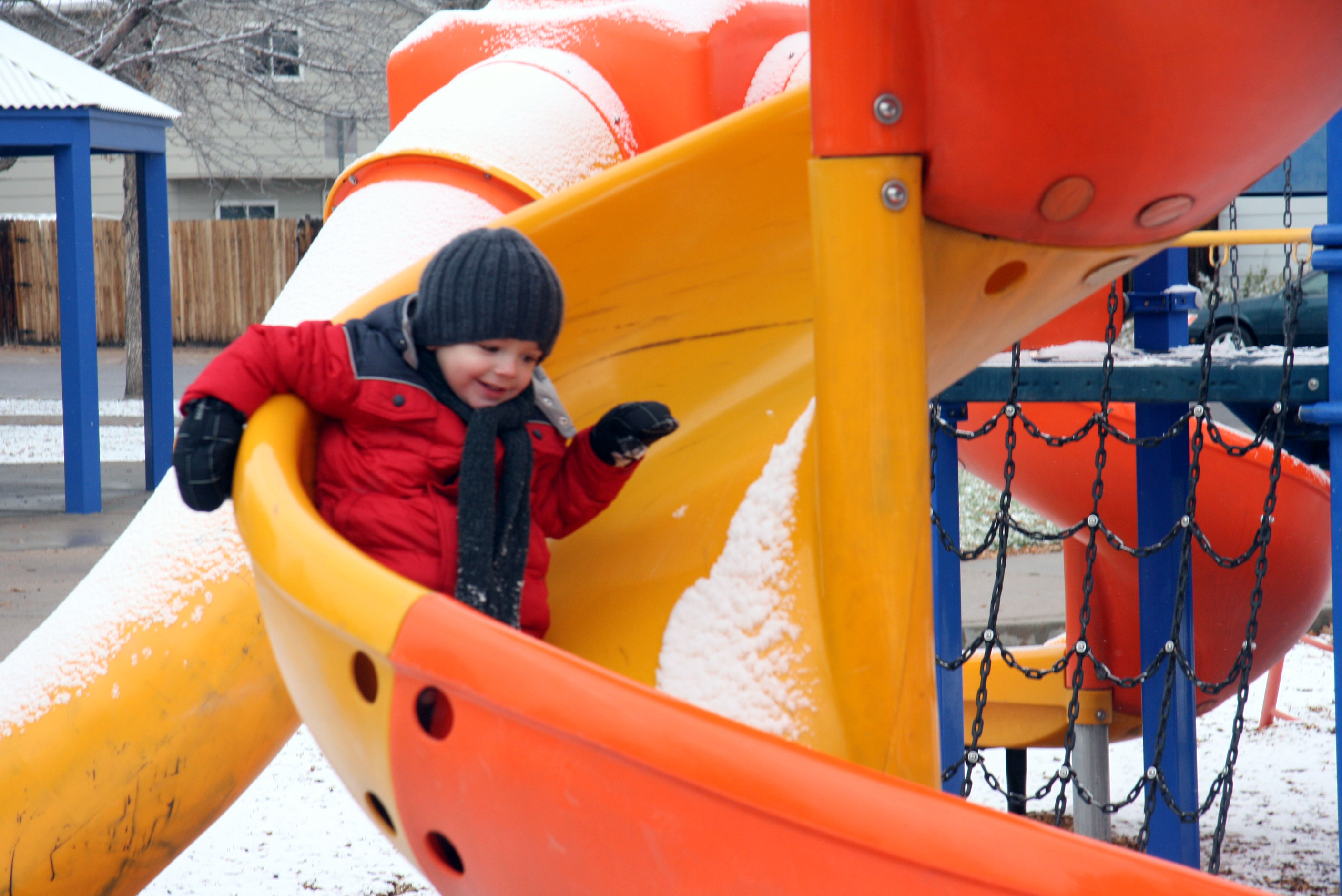 He wanted to walk to the playground, and once we got there, he wanted to climb all over and then go down the slide. I was a little nervous because it was a kind of slippery, and he had his bulky boots on. I followed him closely.