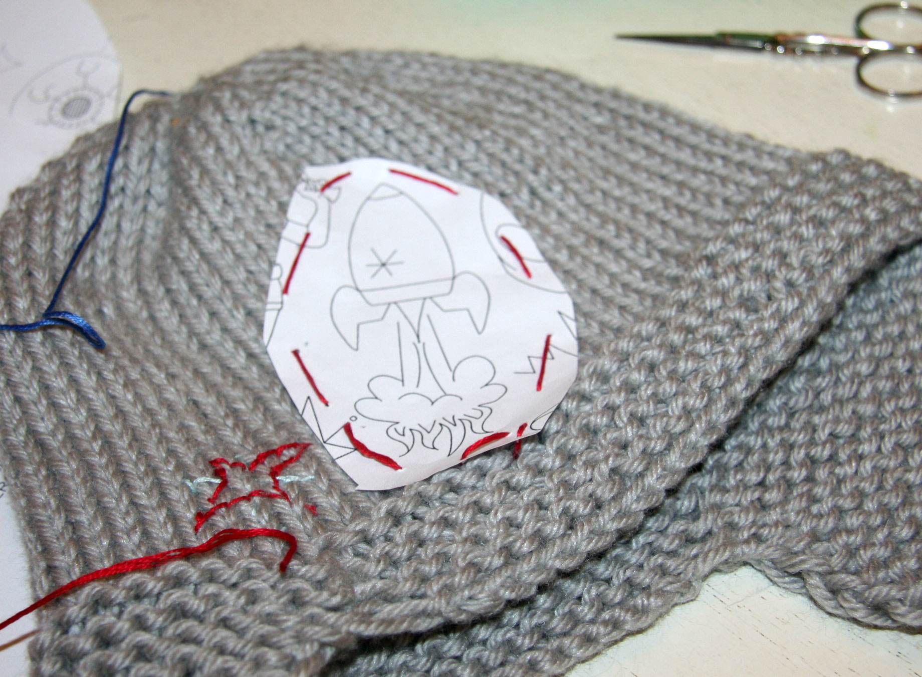 I am not overly happy with this. The floss is not heavy enough against that bulky weight yarn and it doesn’t show up right. I also realized that I went for too much detail and close stitching like you see at the bottom of the rocket. It’s tricky to make it look nice. It was an ok first attempt, and Davey likes his new hat with earflaps, but I wanted to do better.