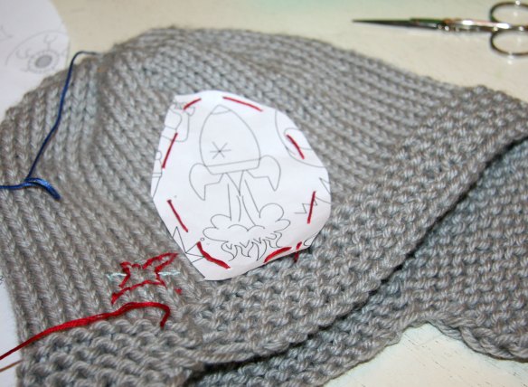 So the finished project was ok, but not great. Notice in the hat below, the little star thing that I’d embroidered in the rocket is gone. Those lines of stitching got all loose and messed up when I worked the paper out. So I took it out.