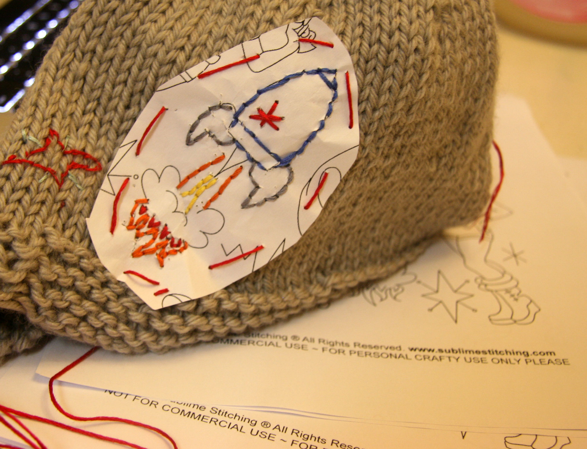 I followed the tutorial which explained that to embroider on a knitted object, you need some kind of stabilizer. For one thing, it keeps the embroidery floss from disappearing into the knitting. This was very simple though, as it consisted of basting the pattern to the hat. I just used some embroidery floss. Like this: