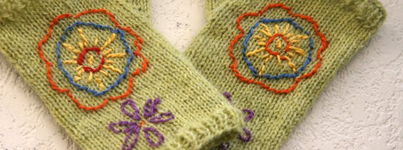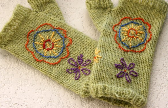 So I knitted some fingerless gloves using one of my favorite patterns the Jiffy Mitts. I used a much lighter weight fingering yarn. On both projects, I used all six strands of floss. I think in the tutorial that I followed, she used 3 strands, but I preferred the look of 6. I got a pattern from Sublime Stitching called “Fantasy Flowers” and I embroidered some flowers onto the gloves. I experimented with the split stitch and the stem stitch, and I found the stem stitch to be a little easier for me. I think I like the look of the stem stitch better, although I can’t tell that much difference, and I like the split as well.