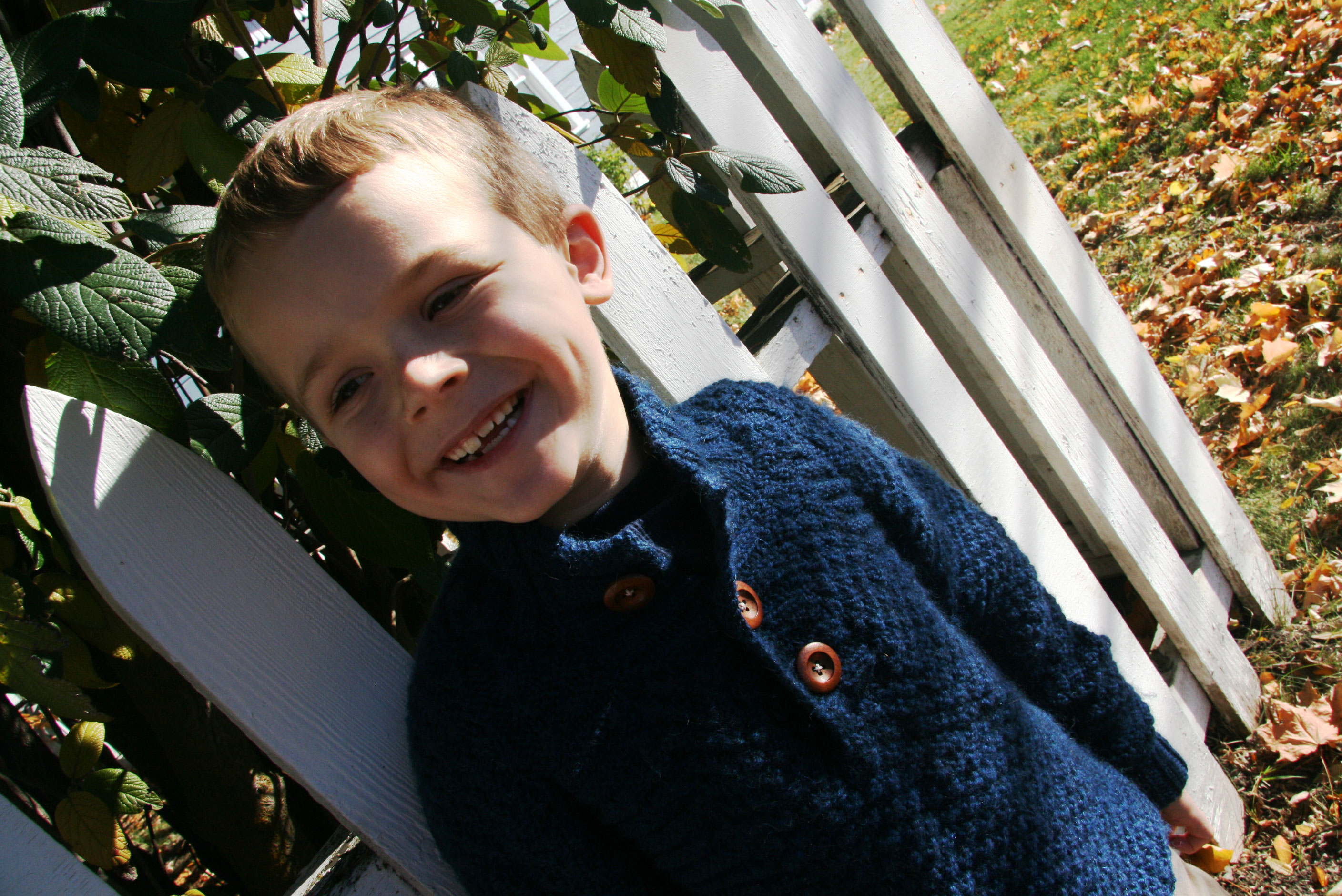 I’d love to make another one of these hats. I loved the yarn too. It’s HiKoo by skacel, and I’d not knit with it before. Really nice to knit with. I did block it on my little mannequin head thing. It smoothed out my decreasing at the top a whole lot. It is a roomy hat, and I wonder if I might not go down a needle size if I did it again. It’s a nice fitting and keep your head warm hat though. Here’s my little spaghetti-sauced faced Davey modeling it for me (I was doing good to get him to cheerfully pose for me; I didn’t want to push my luck by requiring a clean face as well!). This is a great pattern for which to practice stranded knitting. It’s clearly written and very fun!